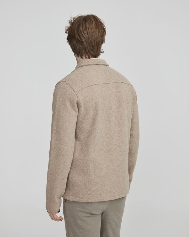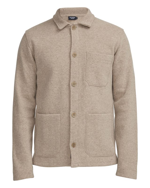 Knitted wool jacket. Five buttons in the front. Three pockets. Knitted in a way that gives the jacket a firm and durable shape.