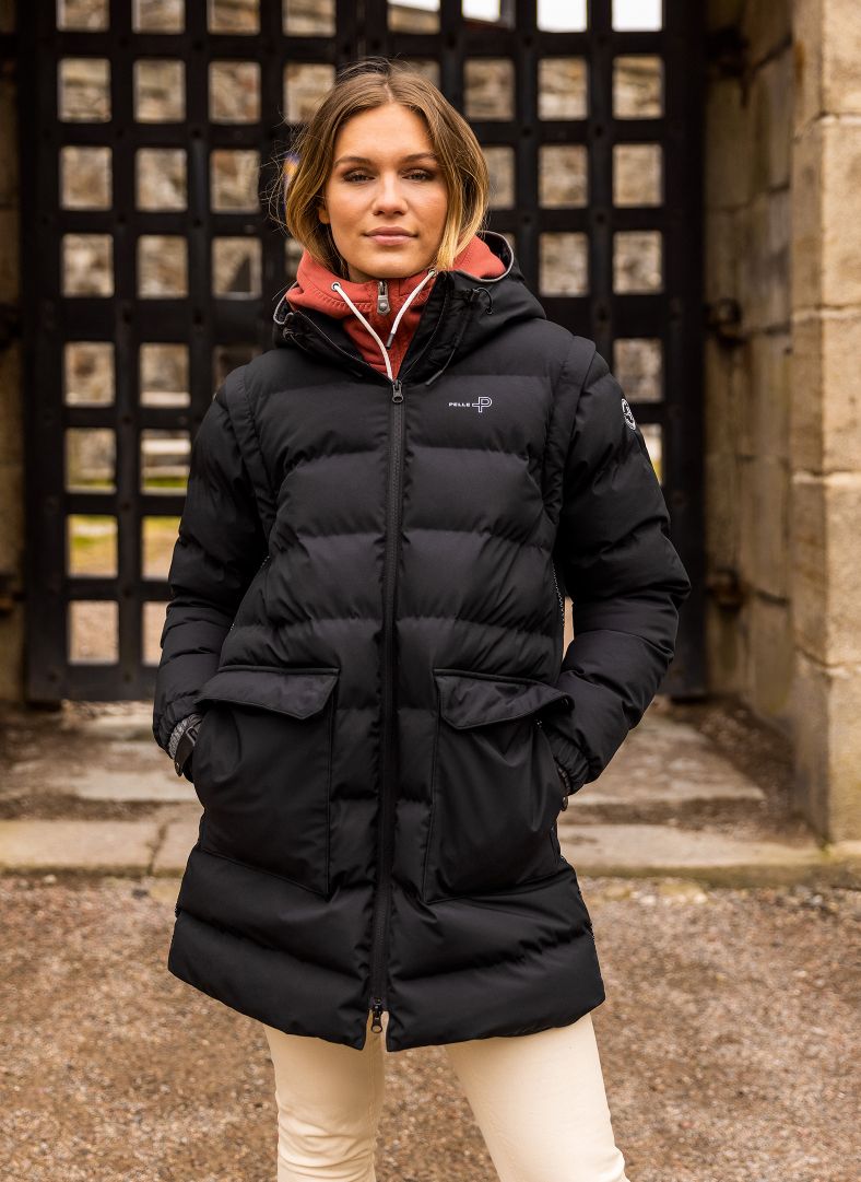 Warm women’s parka with removable sleeves to be worn as a vest.
