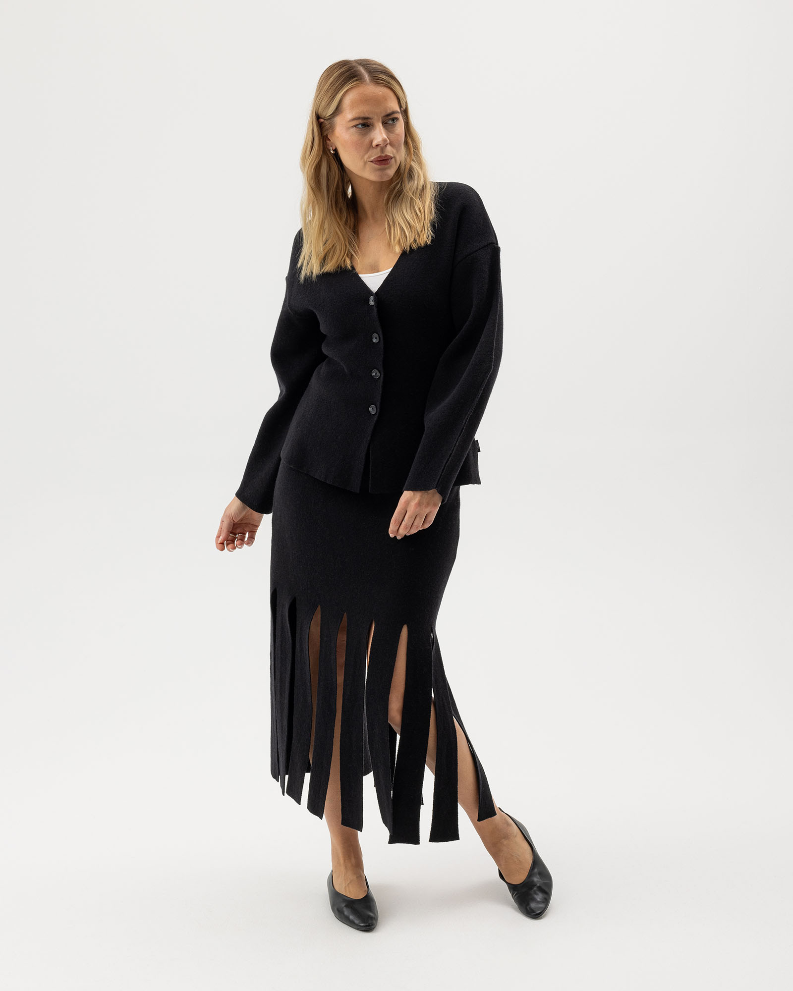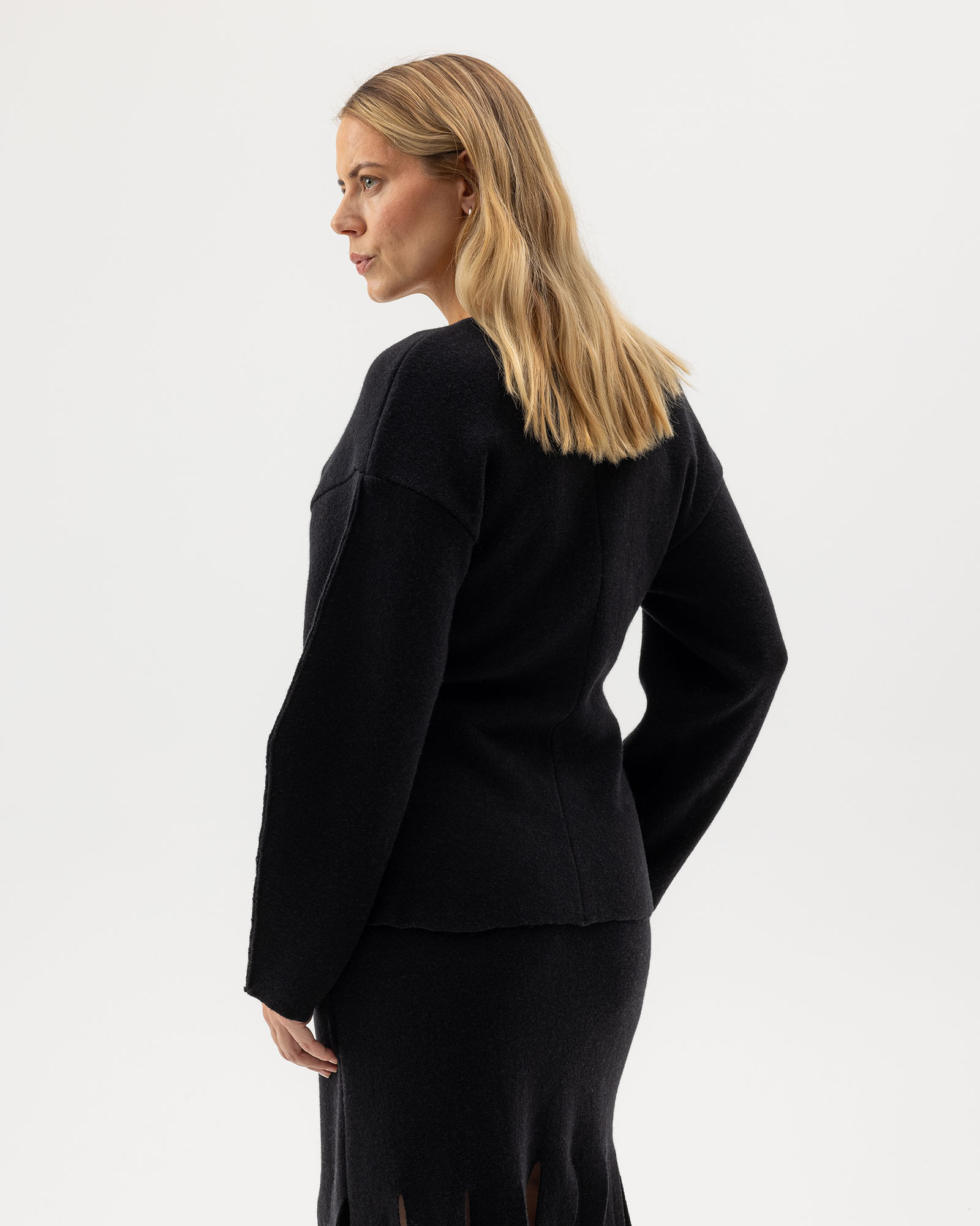 Milano knit blazer in a wool blend. Curved fit and dropped shoulders. Wide, shaped sleeves with decorative seams. Single-breasted with four horn buttons at the front. Sustainably produced in Europe.
