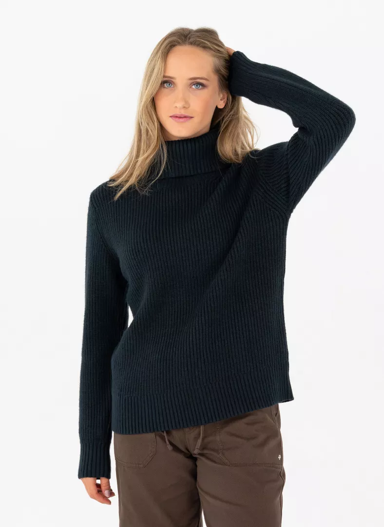 Rib knit sweater with a folded turtle neck and a metal Pelle P badge on the left sleeve. The sweater is made in a soft viscose, polyester and nylon blend with a slightly dropped shoulder and a regular fit. (The garment is correctly portrayed in product images)