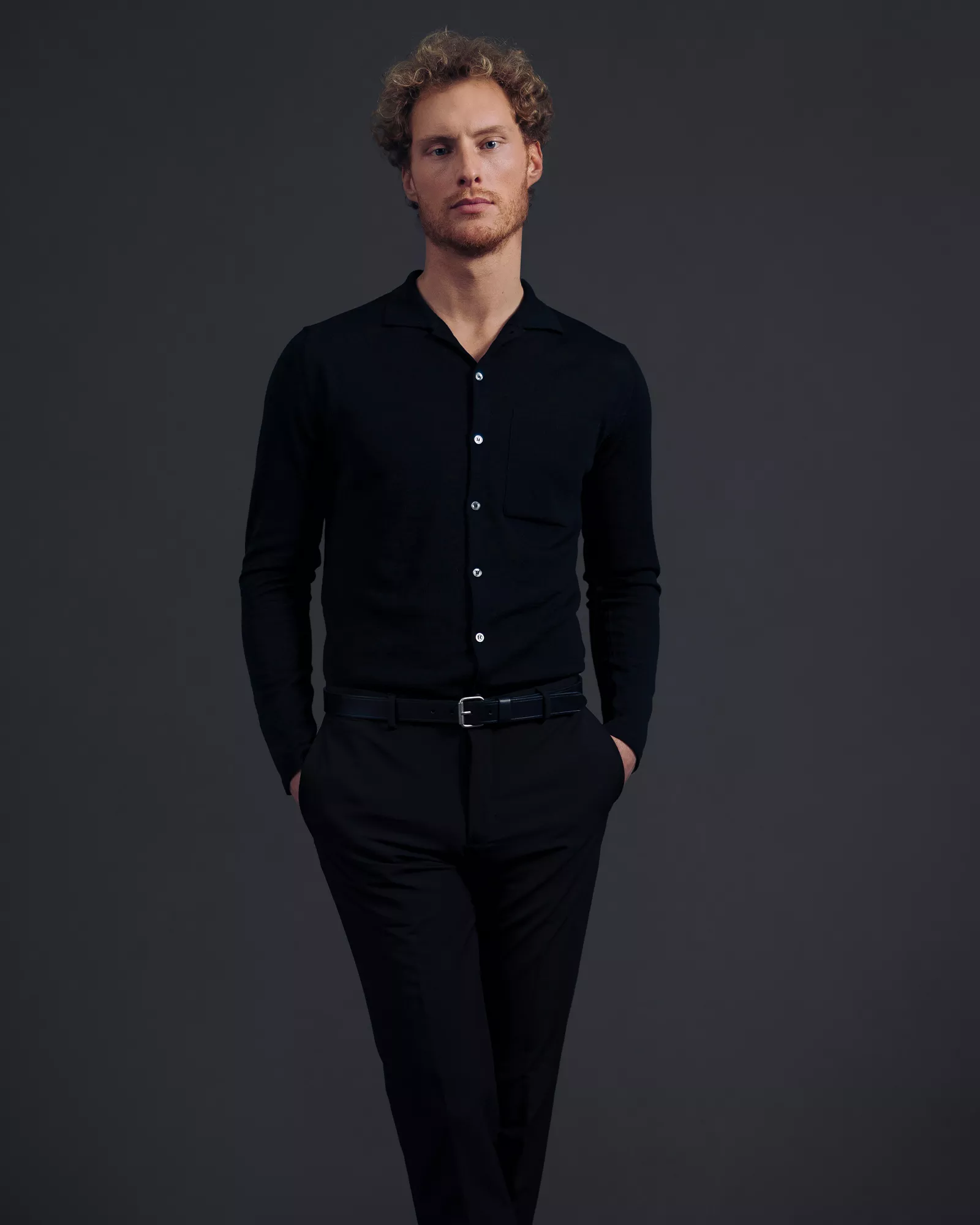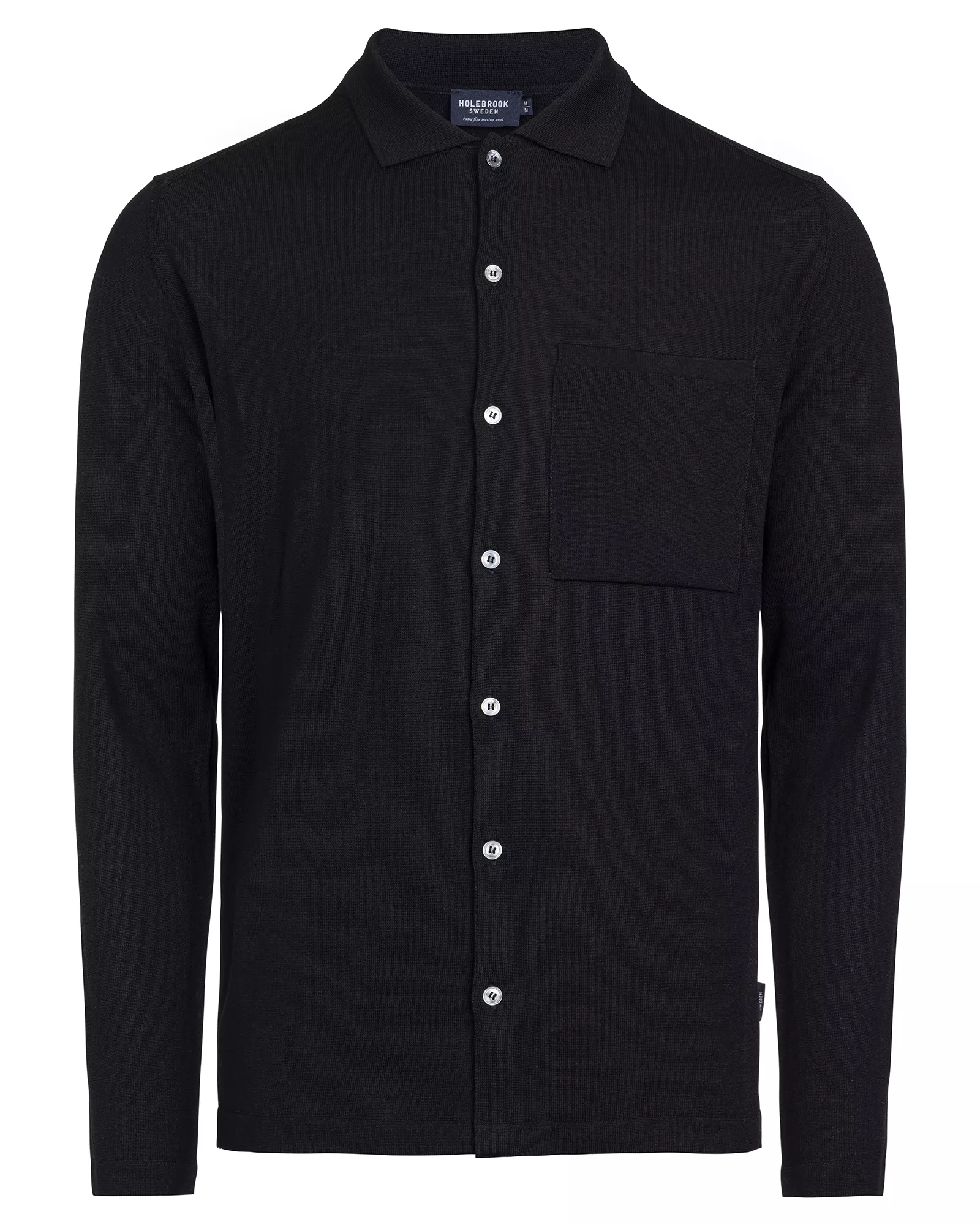 Fine knit shirt in 100% extra fine merino wool. Classic style with buttons and collar. Straight fit. Tubular knitted endings and chest pocket. Merino wool is soft and comfortable to wear and also has several functional properties. It is uniquely temperature regulating, i.e. it breathes and releases moisture and heat from the body when it is hot and at the same time has the ability to retain heat when it is cold. Produced in Europe.