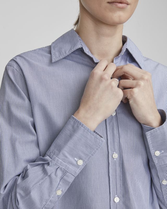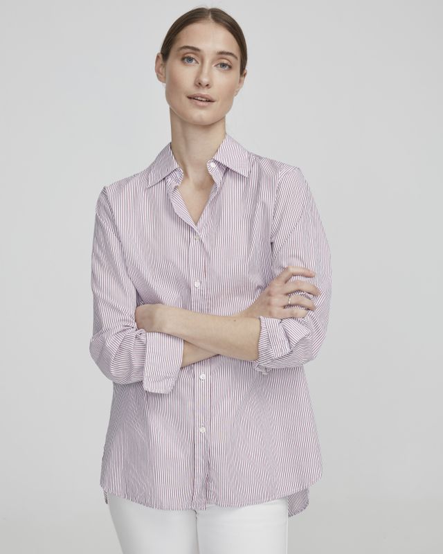 Boyfriend-style long-sleeved cotton shirt. Longer in the back, wide cuffs with a single button.