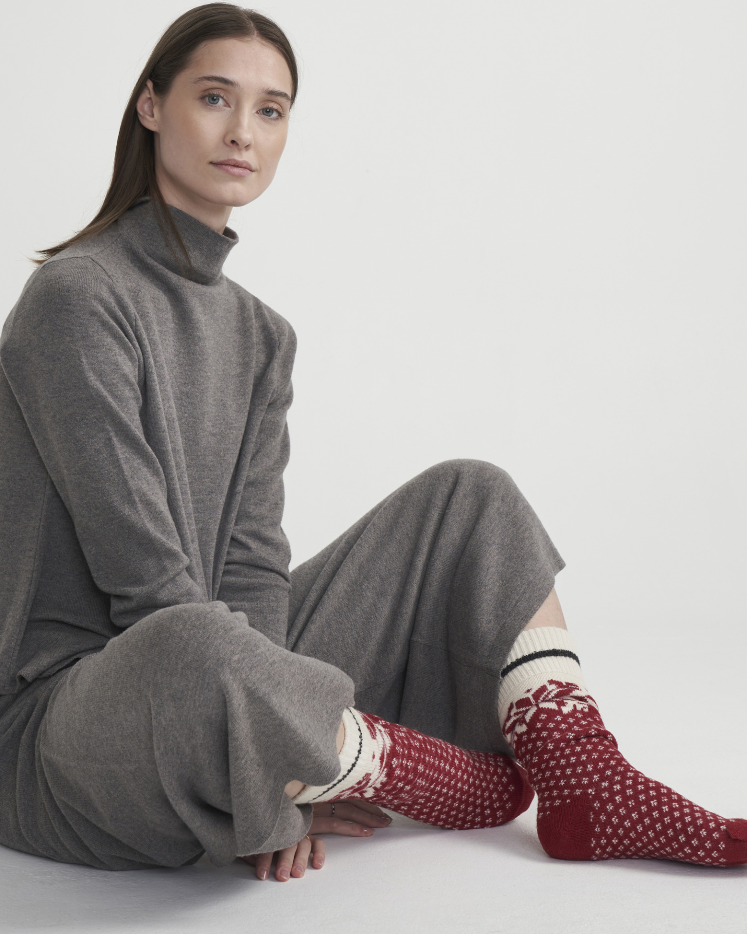 Jacquard knitted socks with beautiful snowflake pattern. Made of our soft wool blend which keeps you warm.