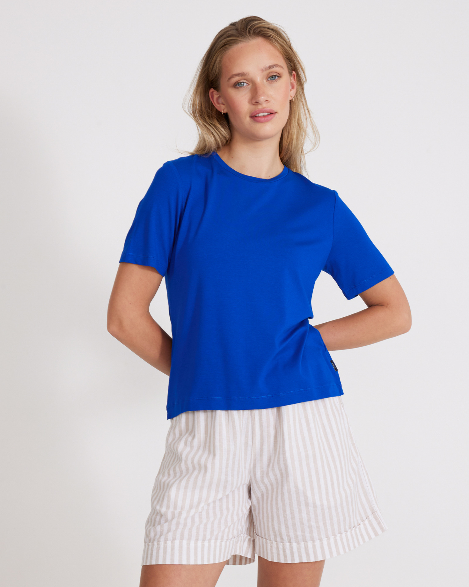 A basic t-shirt with short sleeves and slits at bottom on both sides. Made in our soft viscose quality which gives the garment a heavier and compliance feeling.