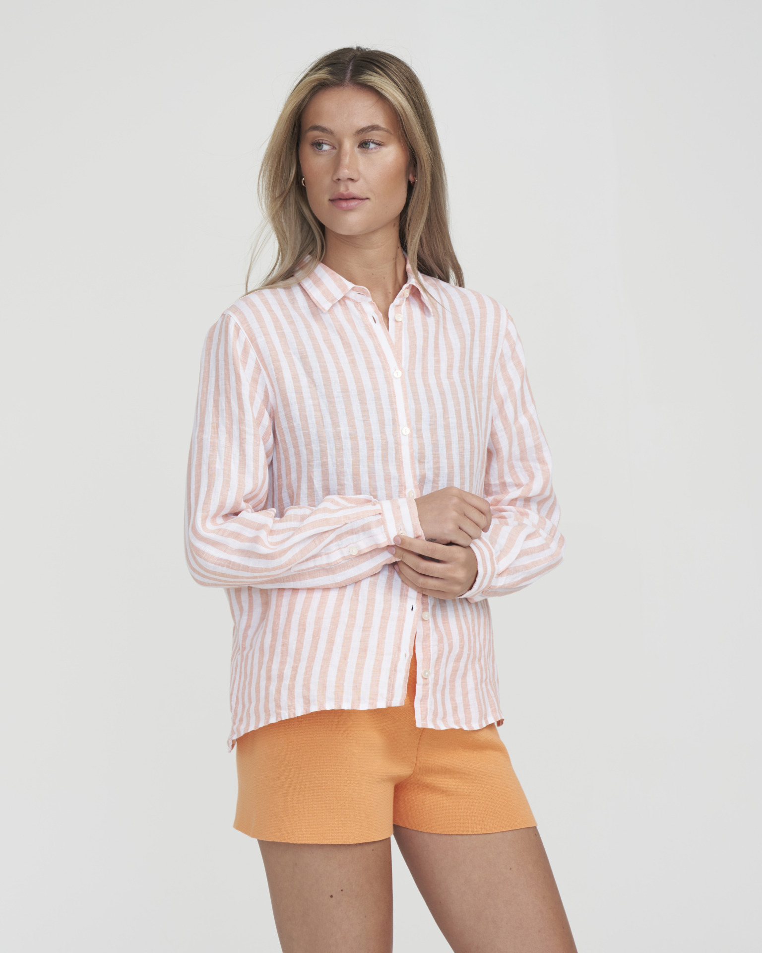 A classic shirt with collar in lovely linen blend. Straight hemline with smalll slitses at the sides. Nicely decorated with pearl buttons.