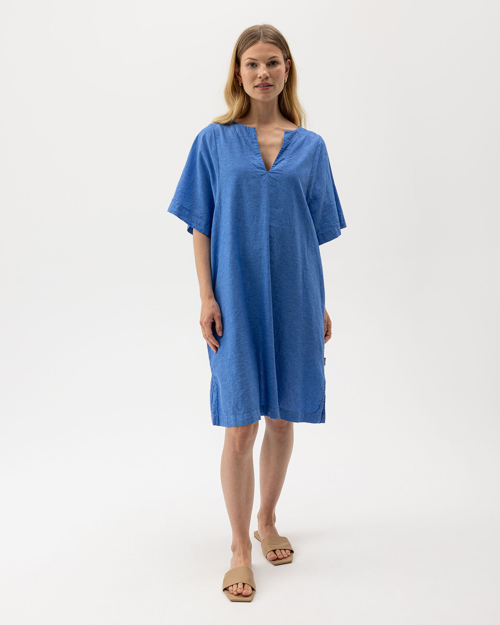 Short sleeved dress made in a soft linen and cotton blend which is cool and breathable. Relaxed fit with side pockets, v-neck and slit. Length below the knee. The fabric is Oeko-Tex® certified. Sustainably produced in Europe.