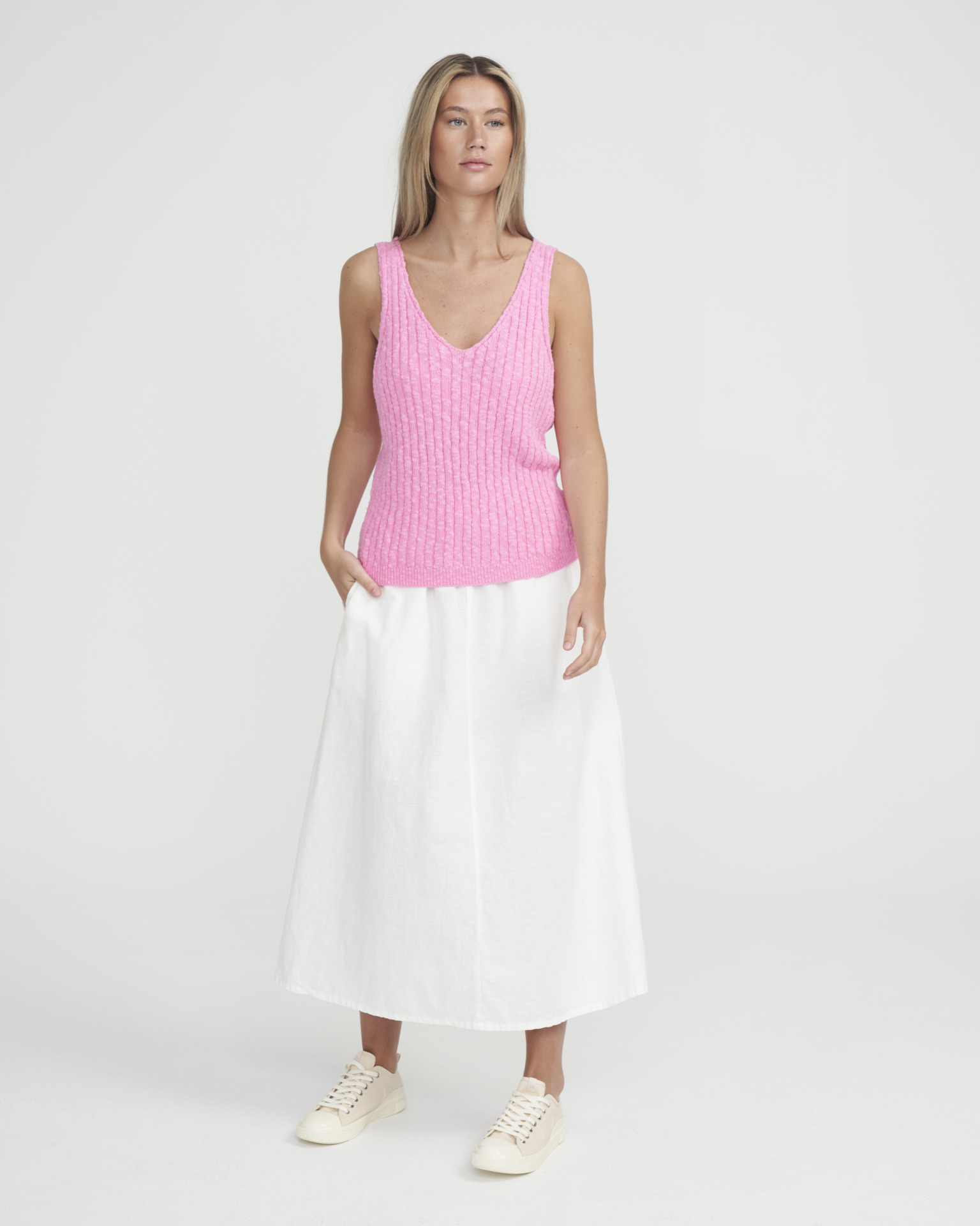 A rib knitted top in our lovely slub quality made of 100% cotton. V-neck both at front and back. Match with the Marina skirt.