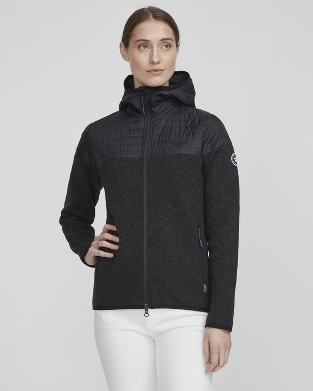 Knitted wool jacket with windproof lining. Quilted water-repellant details, hood. Two-way zipper.