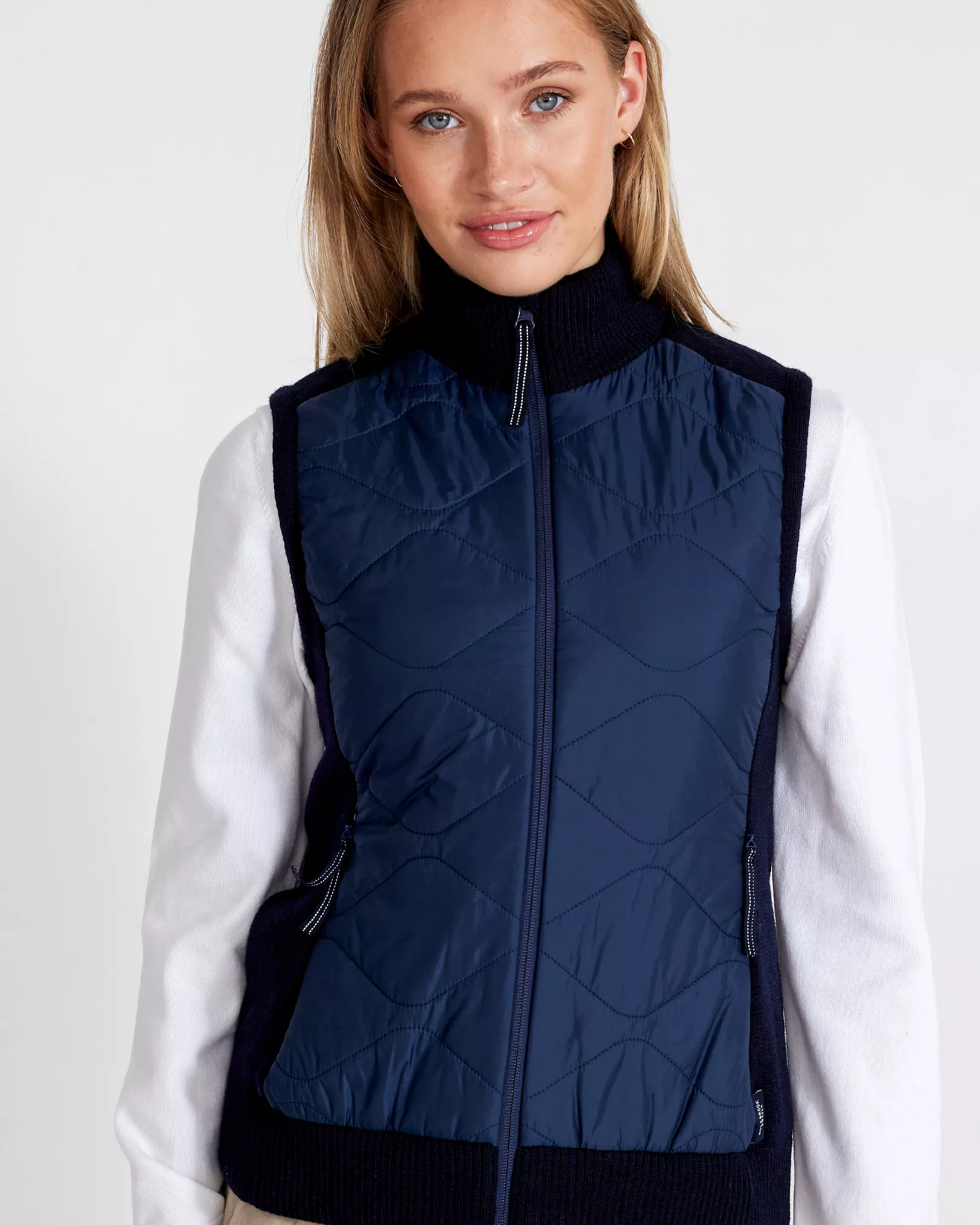 Knitted windproof vest with water-repellent quilted details. The vest is milano knitted in 100% exclusive wool yarn that is certified with bluesign®. High collar with knitted cotton on the inside. Pockets on the sides, two-way zipper and reflective details. The water-repellent quilted details have a membrane made of Swedish wool. The lining is windproof and consists of 96% polyester and 4% elastane. No chemicals are used to achieve the windproof function. Instead, the lining is manufactured with a special weaving technique that makes the fabric extremely tightly woven and therefore also windproof, while the fabric breathes. The water-repellent material (Piumi®) has a treatment that creates a water-repellent function. The treatment is ecological and free from fluorocarbon, which is a common chemical used to create waterproof fabrics. Piumi is also a material that breathes. The elastane makes the fabric stretchy, which means it stops the wind but not the movement. The fabrics are labeled with ÖKO-tex® Standard 100, which guarantees that the fabric is free from harmful substances. Sustainably made in Europe.