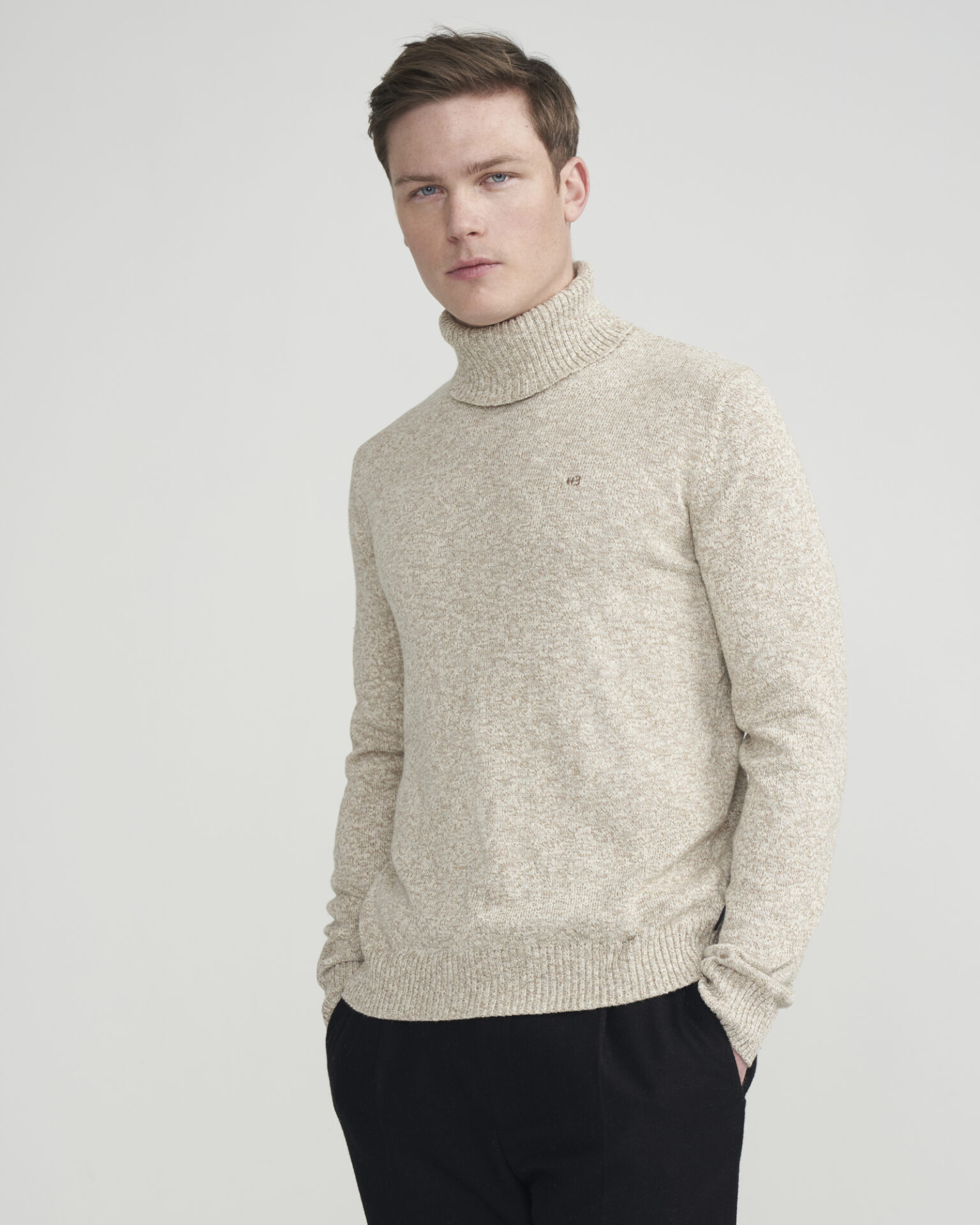 Knitted roll neck in recycled soft cotton blend.
