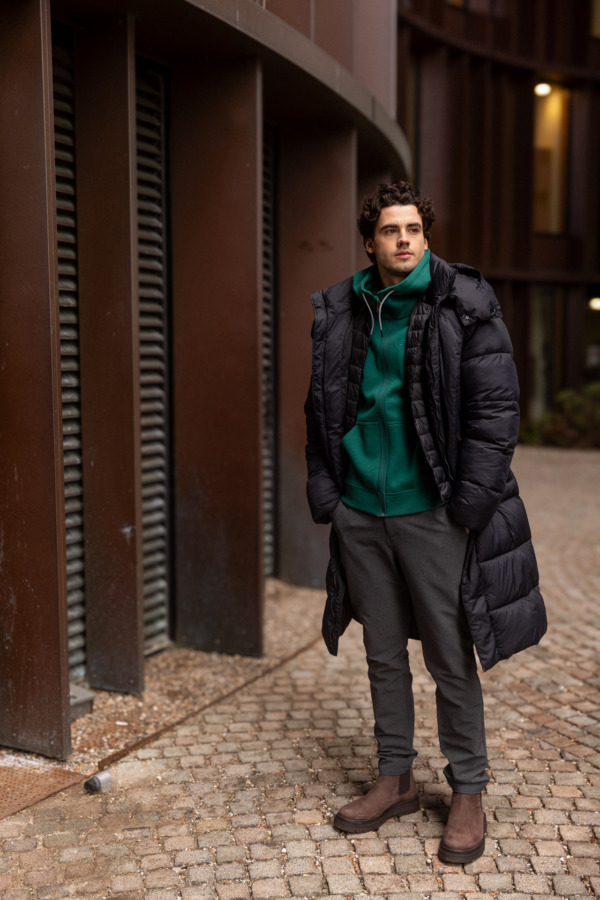 This coat is made of recycled polyester with ball fiber padding consisting of 30% Sorona® and 70% recycled polyester from PET bottles. The outer fabric is water-repellent with a PFC-free DWR treatment. The coat features a YKK VISLON® Soft Touch 2-way zipper in matte black at the center front, two front pockets with invisible magnetic buttons, and two side pockets with fleece lining. Inside, it has two mesh pockets and a chest pocket with a zipper inside. Adjustable drawstrings in bottom hem, provide a flexible fit. Elastic cuffs inside sleeve ends. The coat also has a detachable hood, reflective P logos on the hood, center back, and collar, and a rubber metal badge on the sleeve. Loose fit.