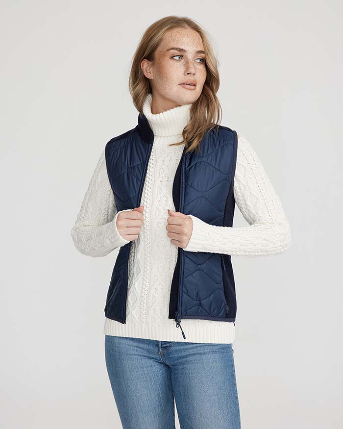 Combinated knitted windproof vest in soft wool blend. YKK reverse zipper, two way. Hidden zip at side pockets. Quilted Piumi fabric with LavaLan padding (wool padding).  With elastic bounded edges this vest will stay in place when you are active. Regular fit and elastic windproof lining (96% polyester, 4% elastan).