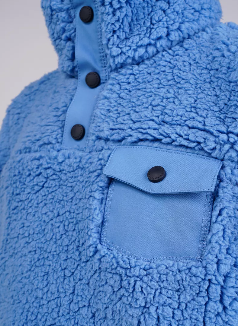Soft and warm children’s sherpa fleece made of 100% lightweight polyester. The fleece features a high collar with three snap buttons for closure. Perfect as a warming layer under a jacket.