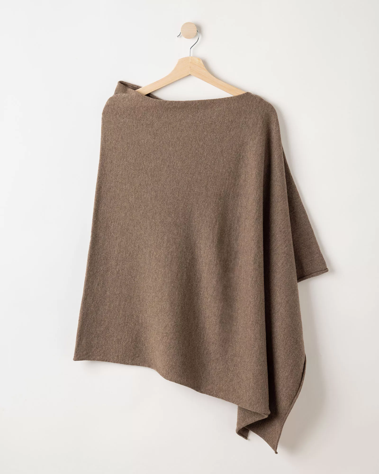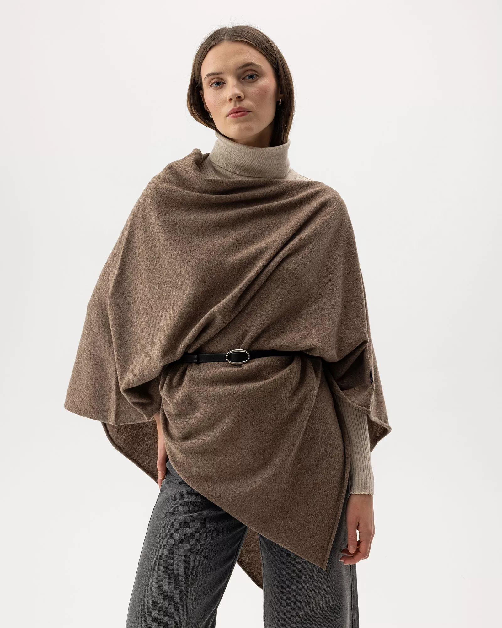 Knitted poncho in extra fine merino wool with raw endings. Can be worn and styled in different ways. The yarn is marked with Woolmark, which guarantees that the product is made of 100% pure wool that meets quality standards. Sustainably produced in Europe.