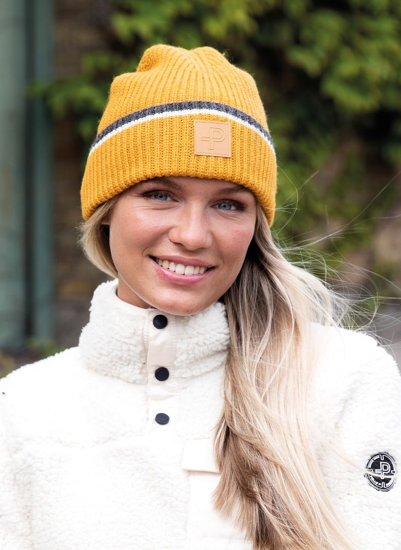 Stylish knitted beanie whit a folda and contrast colored stripe, made in a wool blend, with a reflective P-badge. Perfect for the city and the slope.