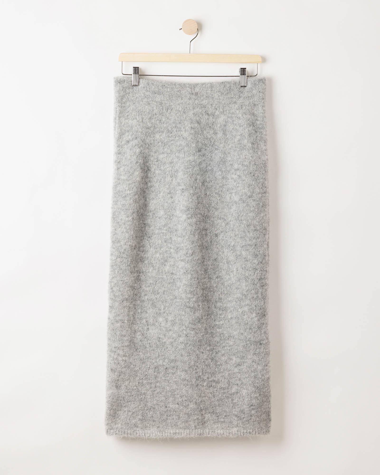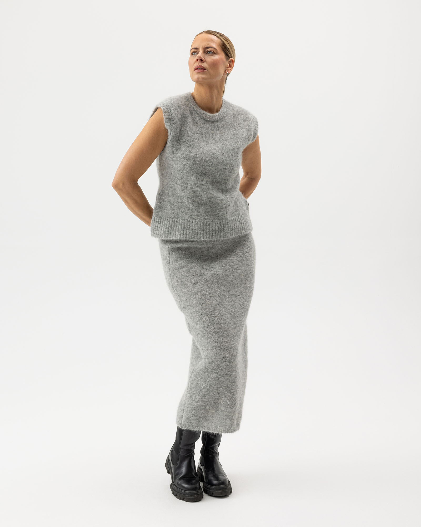 Flat knit skirt in soft and fluffy kid mohair. Elastic waist, straight fit and ankle-length. Wear with Tindra Top  for a matching and stylish set. The yarn is certified according to the Responsible Mohair Standard (RMS) and Global Recycled Standard (GRS). Sustainably produced in Europe.