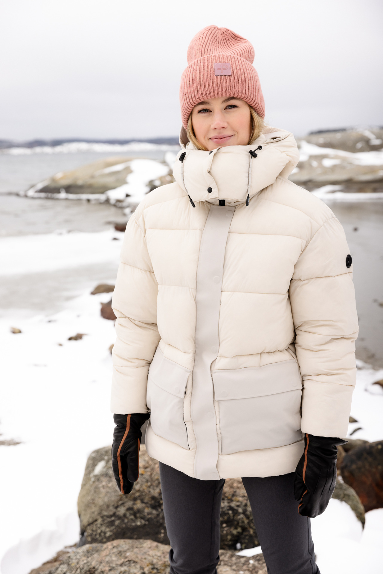 This jacket is made of recycled polyester with ball fiber padding consisting of 30% Sorona® and 70% recycled polyester from PET bottles. The outer fabric is water-repellent with a PFC-free DWR treatment. The jacket features a YKK VISLON® Soft Touch 2-way zipper in matte black at center front, two front pockets with invisible magnetic buttons, and two side pockets with fleece lining. Inside, it has two mesh pockets and a chest pocket with a zipper. Adjustable drawstrings at the waist and bottom hem, along with elastic cuffs inside the sleeves, provide a flexible fit. The jacket also has a detachable hood, reflective P logos on the hood, collar, and center back, and a rubber metal badge on the sleeve. Loose fit. The product images accurately depict the jacket and details.