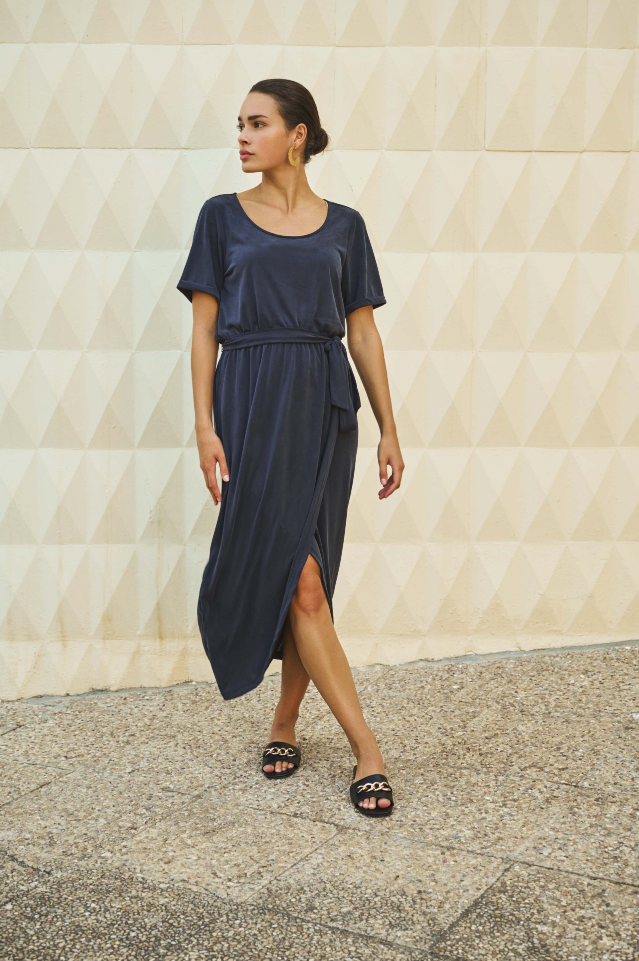 Long round-neck wallet dress with short sleeves. It features a waistband for a better fit.