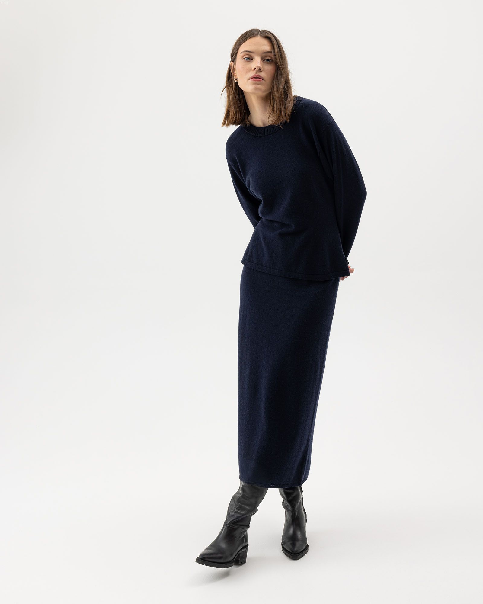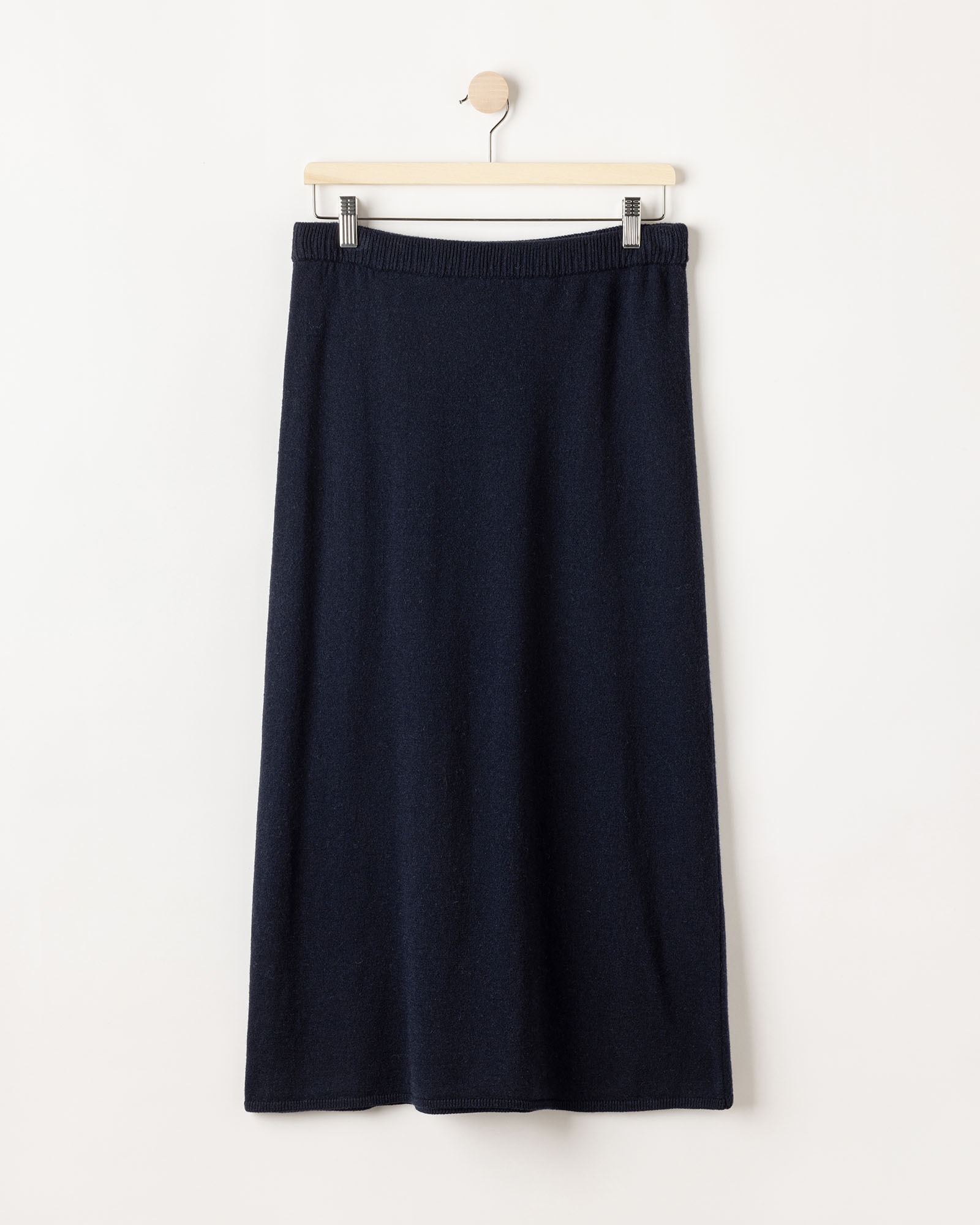Knitted skirt in extra fine merino wool. A-line shape with calf length and elastic waist. Ribbed details at the end. Combine with  Kristina Top for a matched set. The yarn is marked with Woolmark, which guarantees that the product is made of 100% pure wool that meets quality standards. Sustainably produced in Europe.