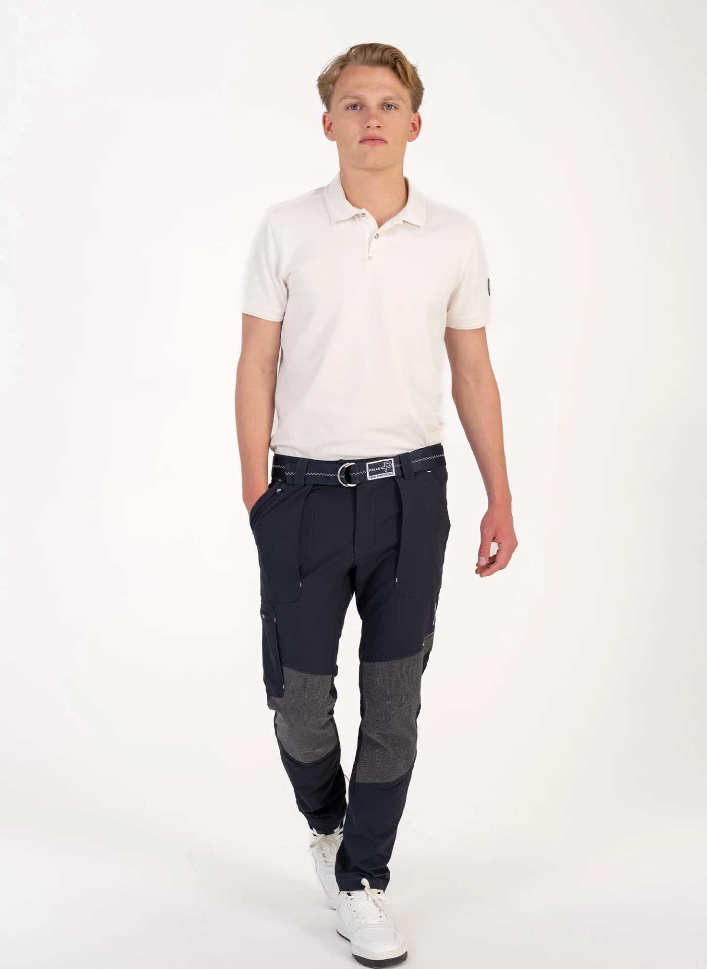• Pelle P ‑kirjailu vasemmassa lahkeessa ja takavyölenkissä ”Navigare necesse est” ‑painatus vyötärön sisäpuolella
