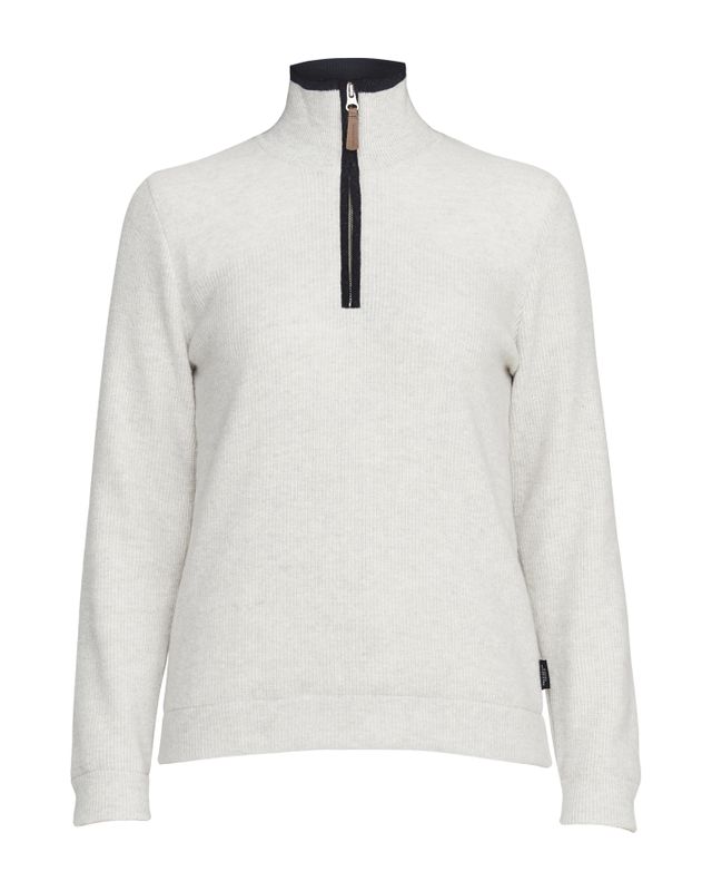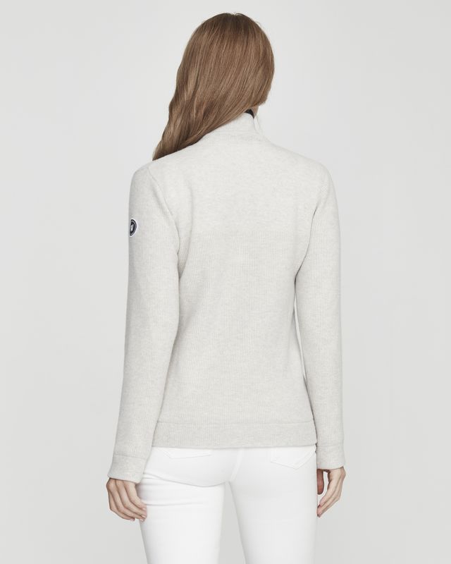 Tuulenpitävä, T-kauluksellinen neulepusero. Korkeassa kauluksessa kontrastivärinen kanttaus. Vasemmassa hihassa logo. Kaksinkertainen resori helmassa ja hihansuissa.