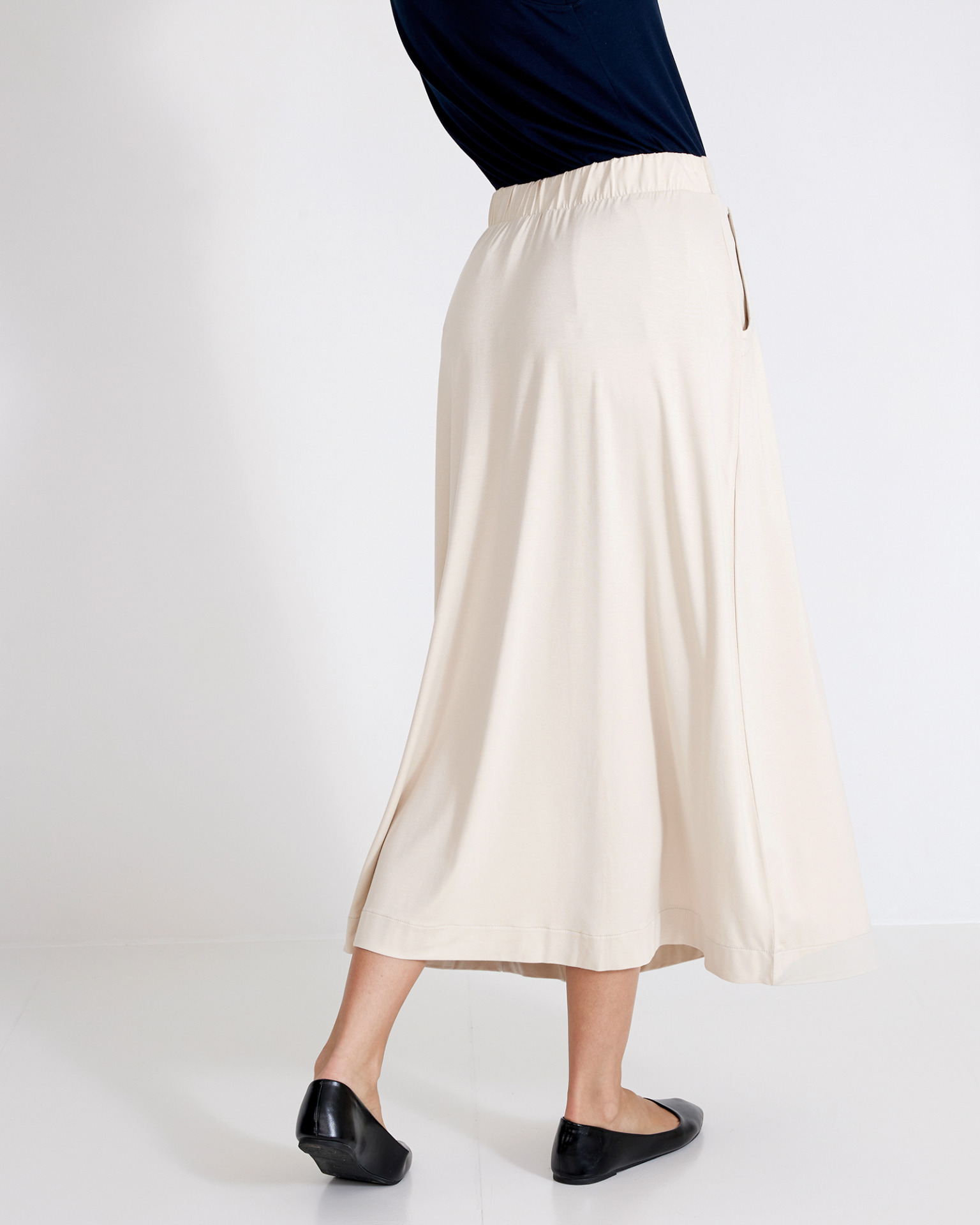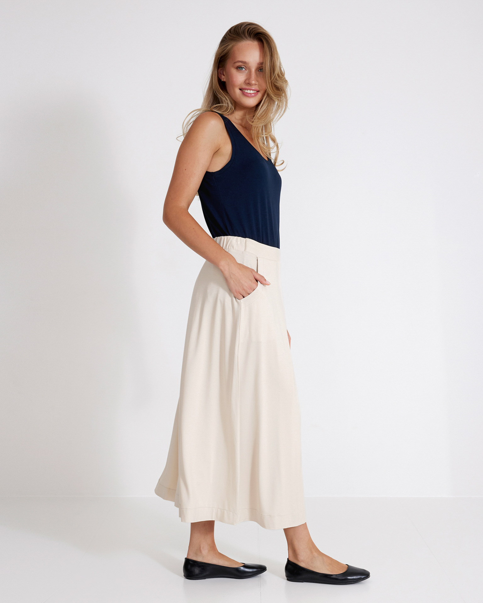 Mukava hame pehmeästä viskoosisekoitteesta. Joustava vyötärö takaa erinomaisen käyttömukavuuden, ja edessä on huomaamaton päällekkäinen halkio. Sivutaskut ja pieni logo sivussa viimeistelevät ilmeen.
