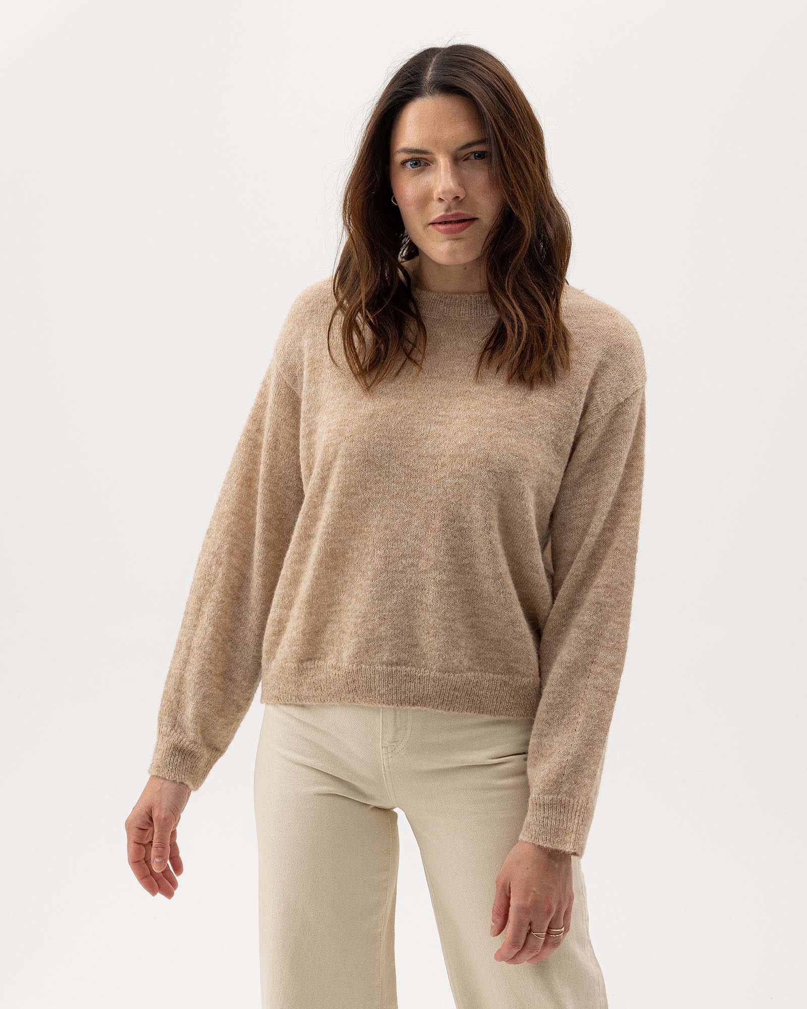 Klassinen väljän istuvuuden neulepusero, joka on valmistettu pehmeästä alpakasta.