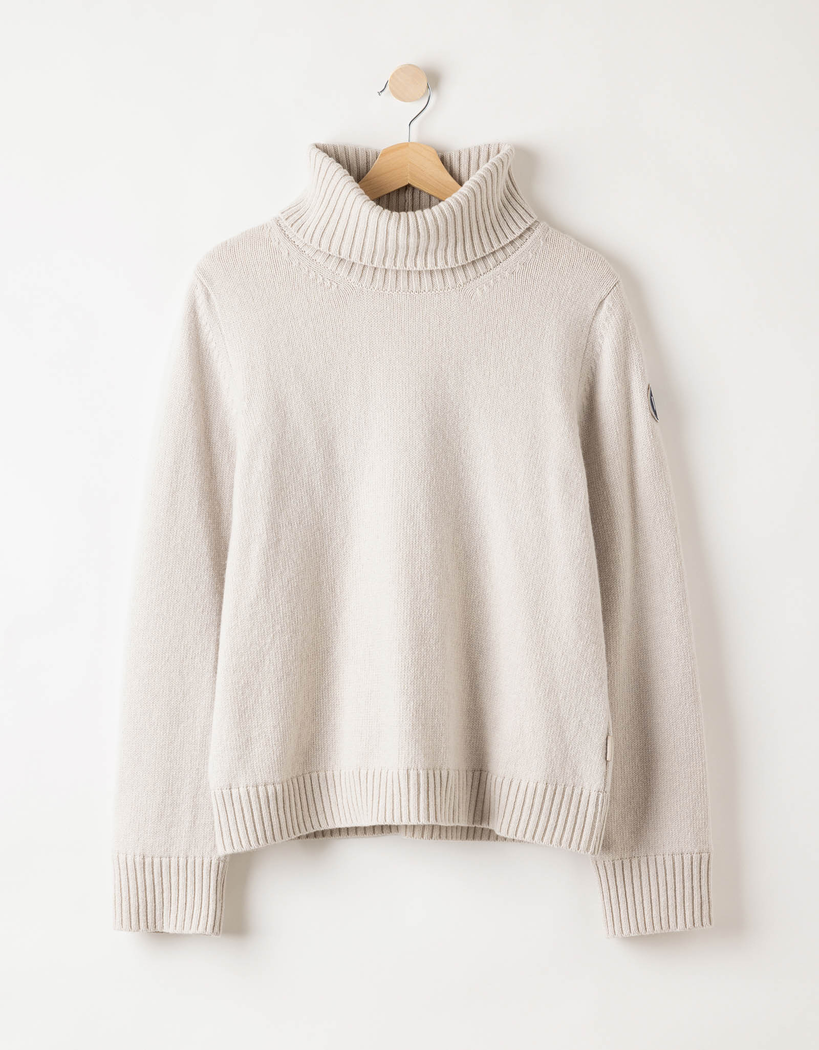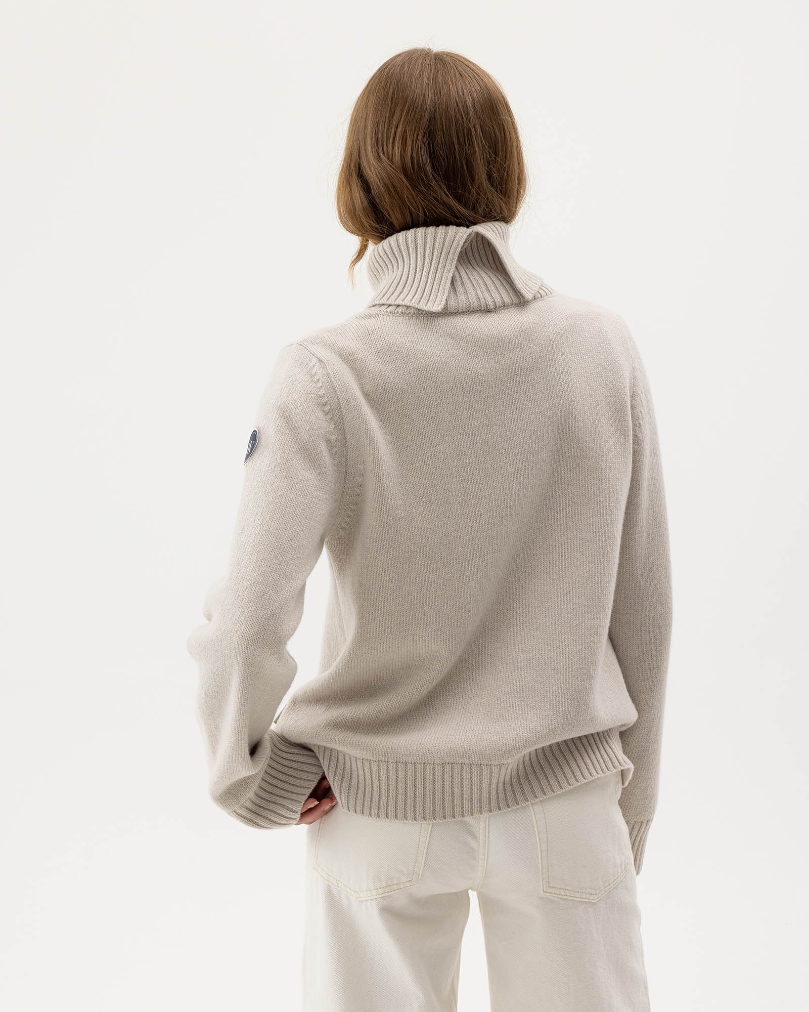 Tuulenpitävä merinovilla–kashmir‑neulepusero. Kaksinkertainen korkea kaulus koristeyksityiskohdalla. Resorineulotut hihansuut ja klassinen, mukava istuvuus. Valmistettu Euroopassa vastuullisesti.
