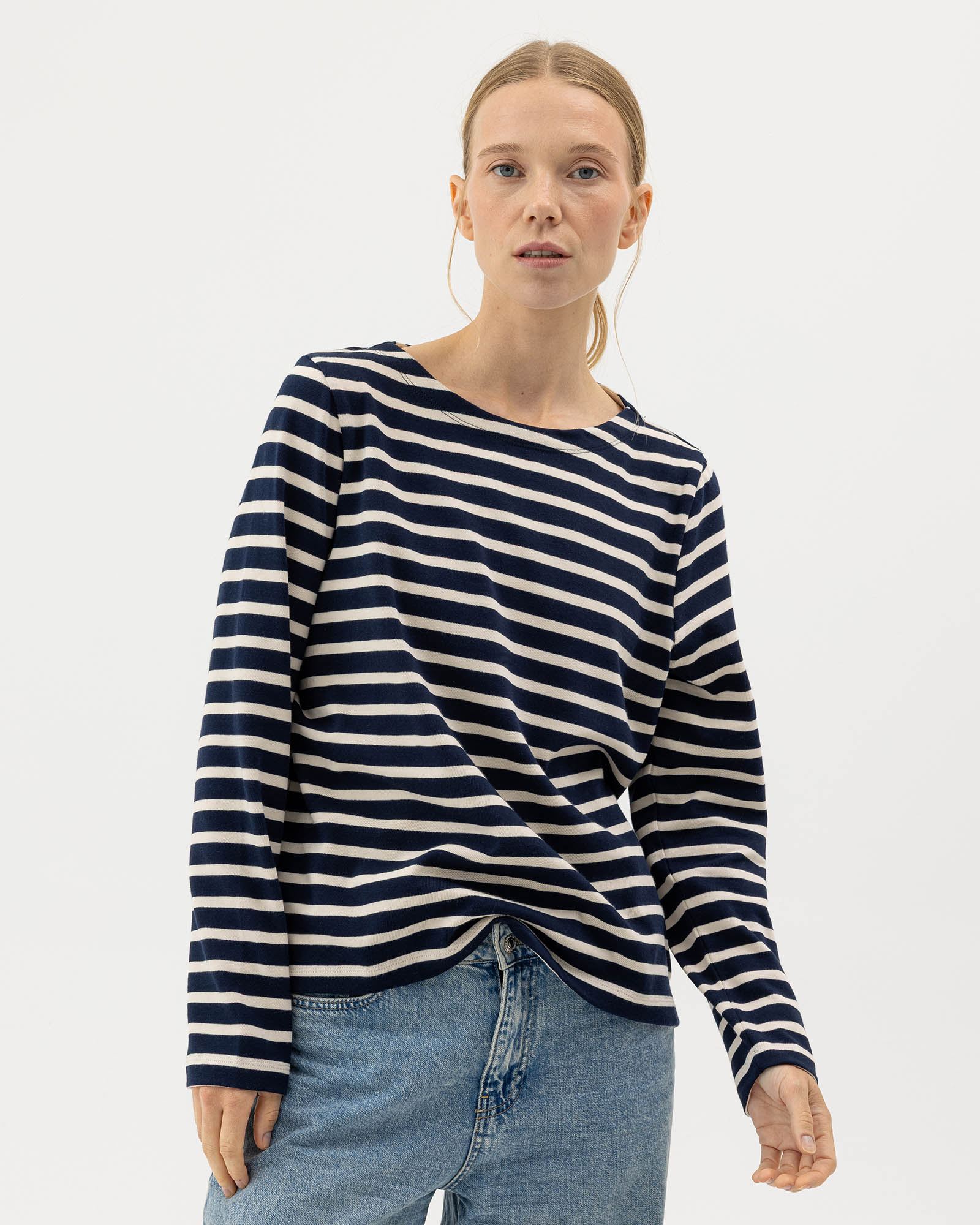 Raidallinen 100 % puuvillainen neule klassisella venepääntiellä. Valmistettu “heavy weight” ‑puuvillasta, joka on hieman paksumpaa, mutta silti viileää ja hengittävää materiaalia. Regular‑mitoitus ja pienet halkiot sivuilla. Valmistettu vastuullisesti Euroopassa.