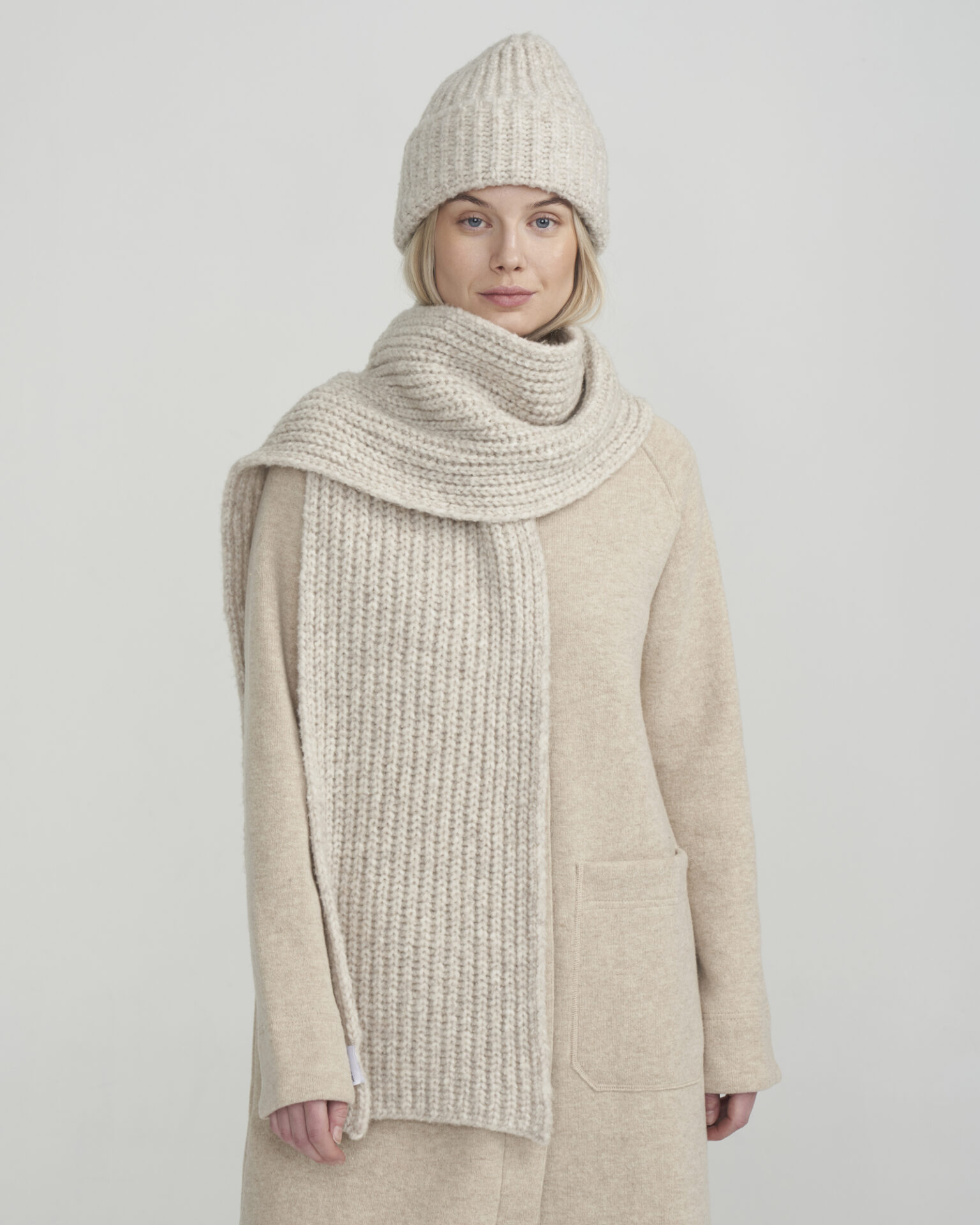 Muhkea joustinneuleuivi erittäin pehmeää merinovillaa. Sopii Hasselön hattuun.
