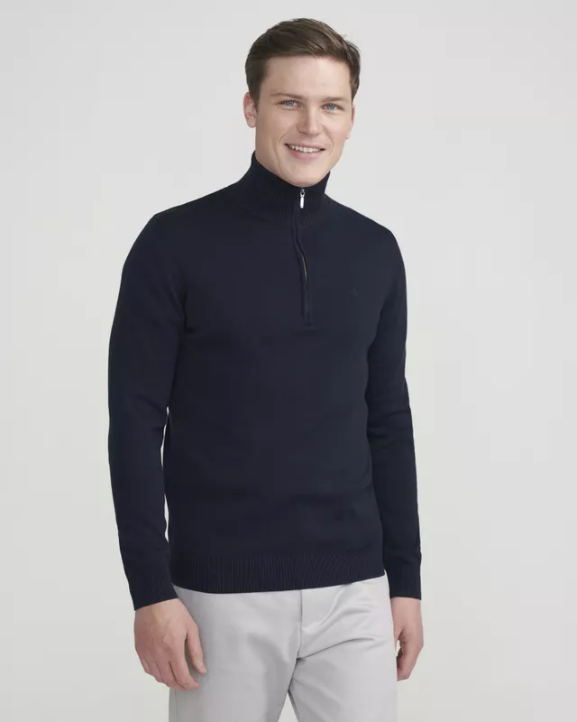 Ohut puuvillainen miesten villapaita vetoketjulla. Kirjailtu logo rinnassa. Korkeampi kaulus pitää kaulan lämpimänä.