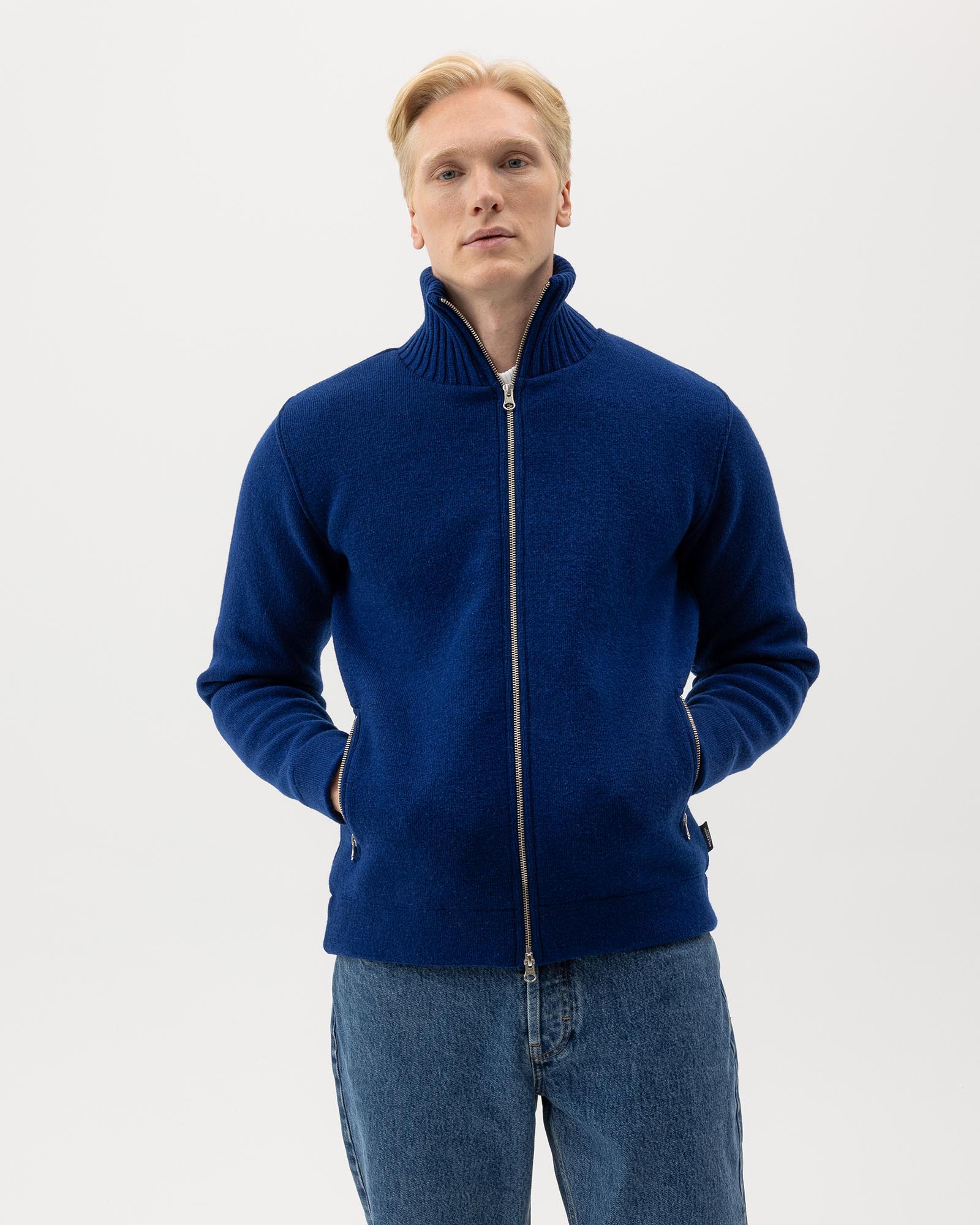 Tuulenpitävästi vuoritettu neuletakki. Kaksisuuntainen metallivetoketju. Suora malli.
