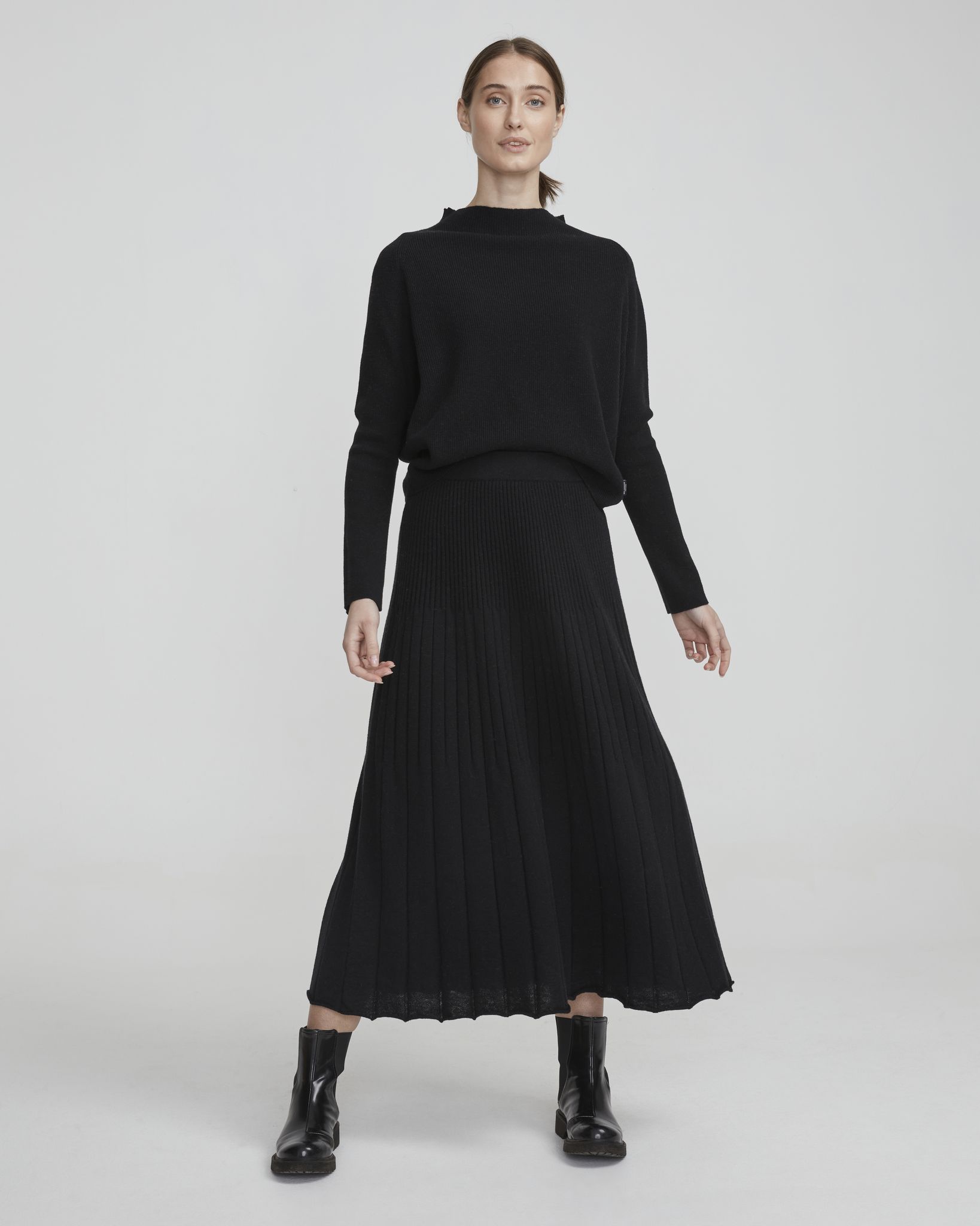 Neulottu hame 100 % extra fine merinovillasta. Ribbineulos luo laskostetun vaikutelman, ja joustava vyötärö lisää käyttömukavuutta.