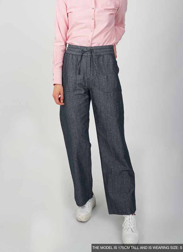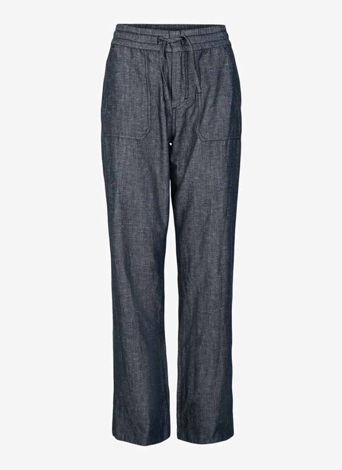 Puuvilla- ja pellavaseoksesta valmistetut naisten housut.