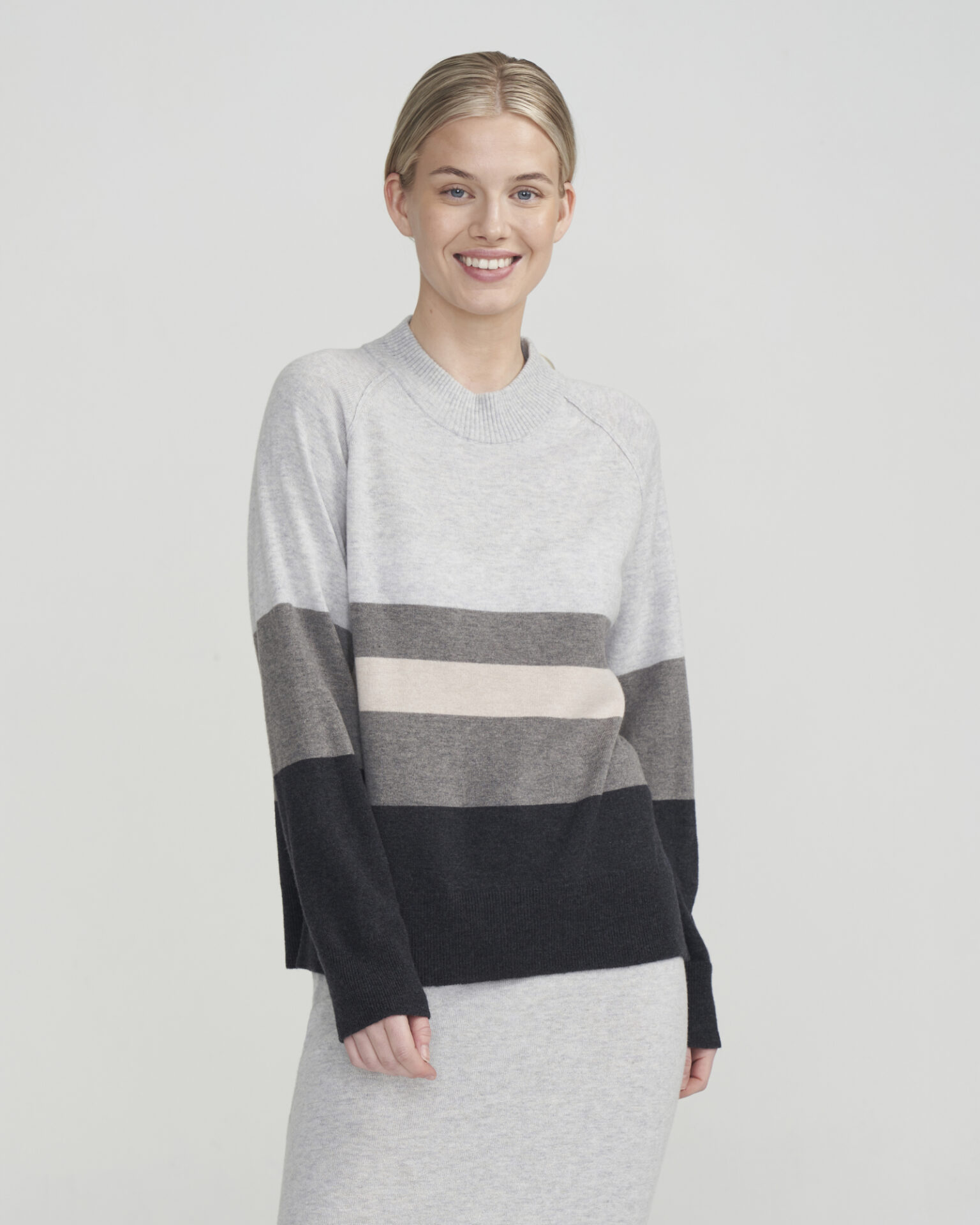 Neule 100 % erityisen pehmeää merinovillaa. Resorit helmassa ja hihansuissa. Halkio niskassa. Klassinen malli ja raglan-hihat.
