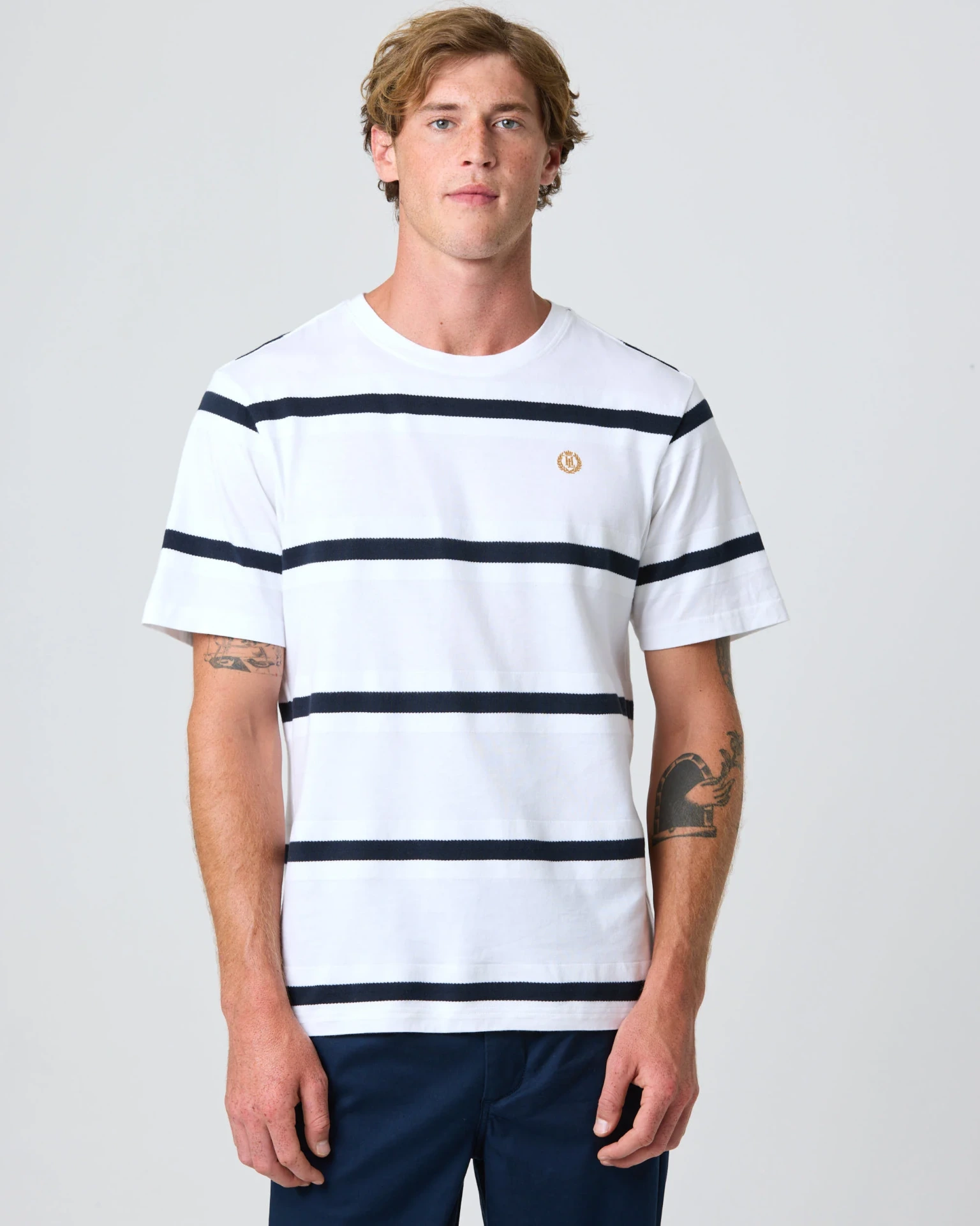 Salcombe T-paita on klassinen lyhythihainen malli, valmistettu 100 % luomupuuvillasta. Paidassa on tunnusomainen jacquard-neulottu tekstuuriraidallinen kuosi, ja joustava ribbineuloksinen pääntie takaa miellyttävän ja hyvin istuvan käyttökokemuksen. Vasemmalla rinnassa oleva Henri-Lloydin kruunu- ja laakeriseppelelogo korostaa brändin laatua ja käsityötaitoa. Monikäyttöinen valinta sekä arkeen että vapaa-aikaan – ajaton lisä jokaiseen vaatekaappiin.