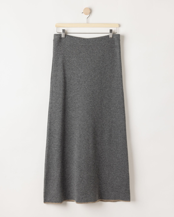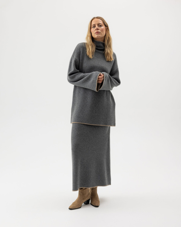 Neulehame pehmeästä kashmirsekoitteesta. Hameen sisäpuolella on kontrastiväri, joka näkyy tyylikkäästi helmassa ja takahalkiossa. Joustava vyötärö, pohjepituus ja kevyesti A-linjainen leikkaus tekevät istuvuudesta mukavan ja naisellisen. Yhdistä Sally Turtle -neuleeseen saadaksesi yhtenäisen ja tyylikkään asukokonaisuuden. Hameessa on väljä mitoitus – normaalin istuvuuden saavuttamiseksi suosittelemme valitsemaan yhtä kokoa pienemmän. Käytetty lanka on GRS-sertifioitu, mikä takaa korkeamman kierrätysmateriaalin määrän, jäljitettävyyden sekä sosiaaliset ja ympäristövaatimukset. Valmistettu vastuullisesti Euroopassa.