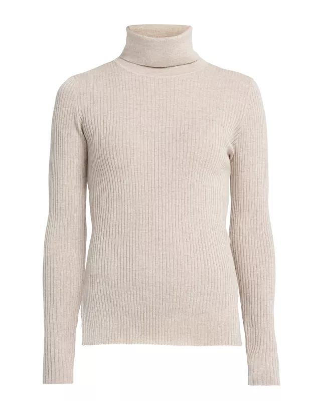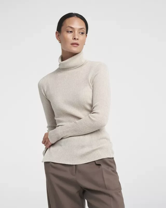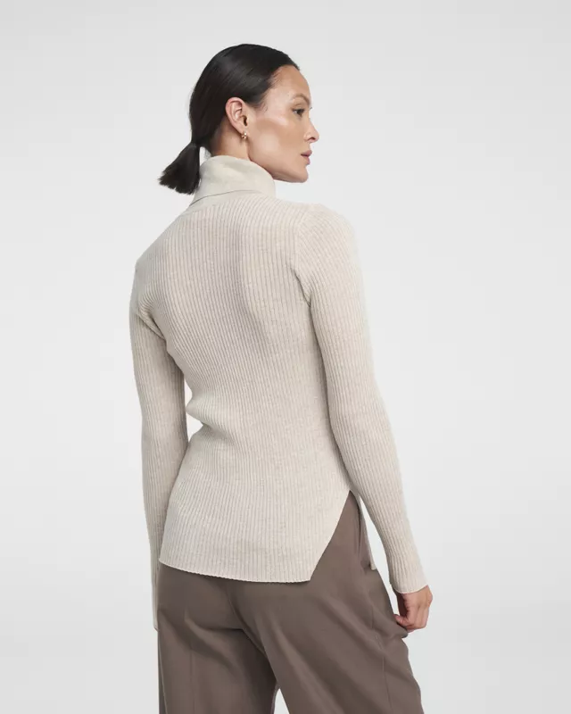 Korkeakauluksinen kylkineulepusero kevyttä merinovillaa. Oikealla alareunassa on halkio. Sopii hyvin laskostettujen housujen tai farkkujen kanssa.