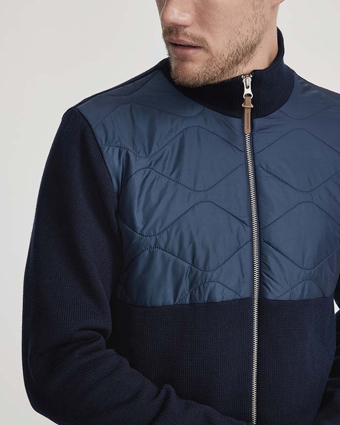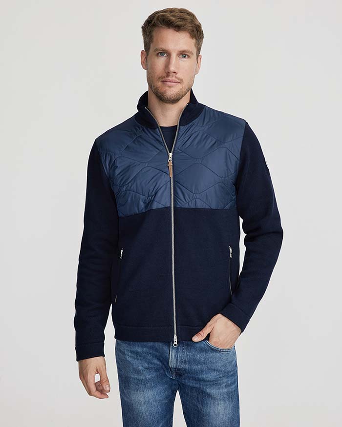 Tuulenpitäväksi vuoritettu neuletakki. Takin tikatussa osassa on LavaLan-villatäyte.