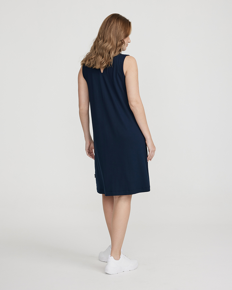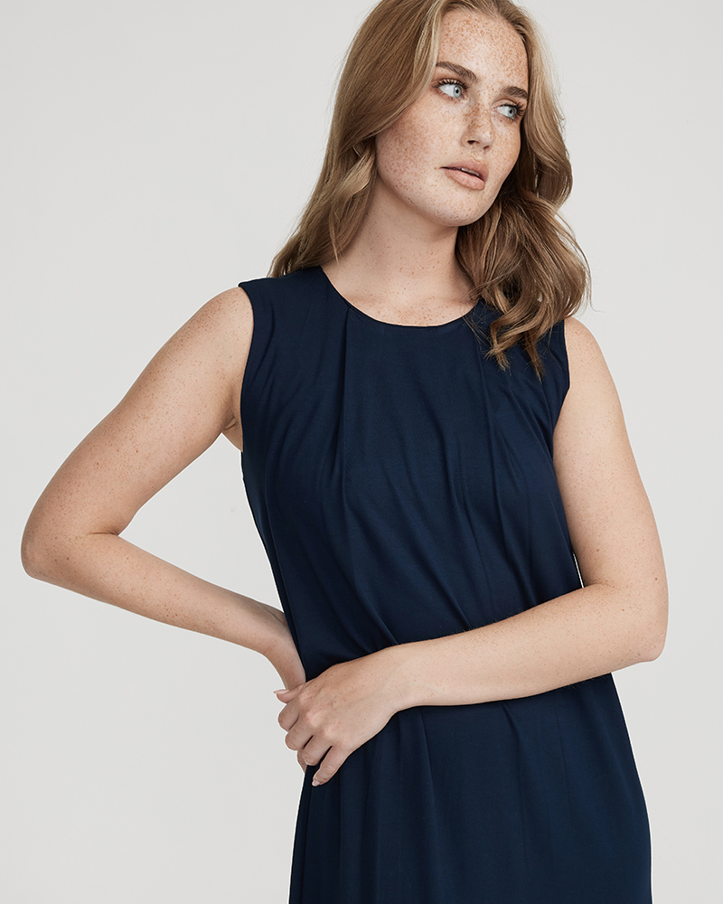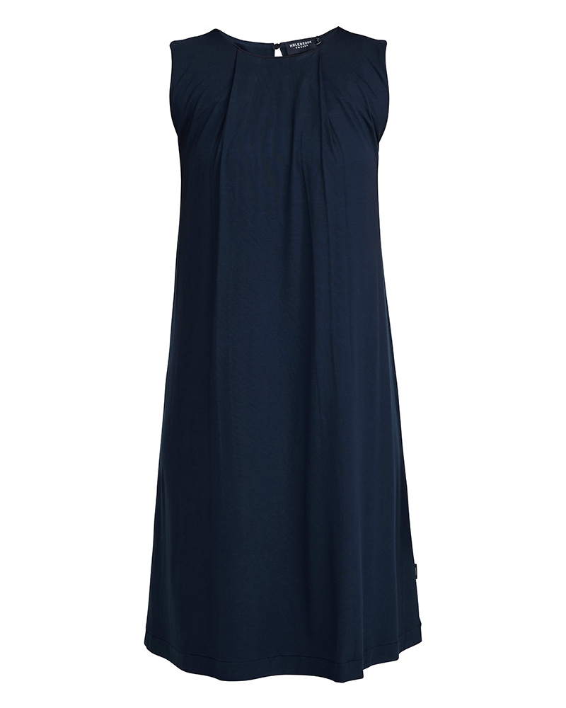 Suvine, väga mugav, varrukateta kleit, tavaline istuvus. Selja peal nööbiga detail. Ees voldid, mis annavad kleidile avarust.