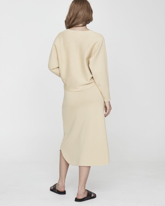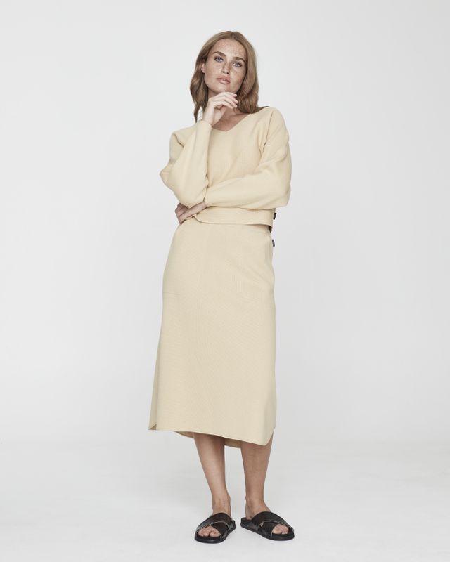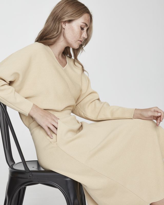 Puuvillane kootud seelik. A-lõige. Ees suured taskud ja ümar alläär. Sobita kokku Barbro jaki või Barbro sviitriga. Tagaosa veidi pikem.
