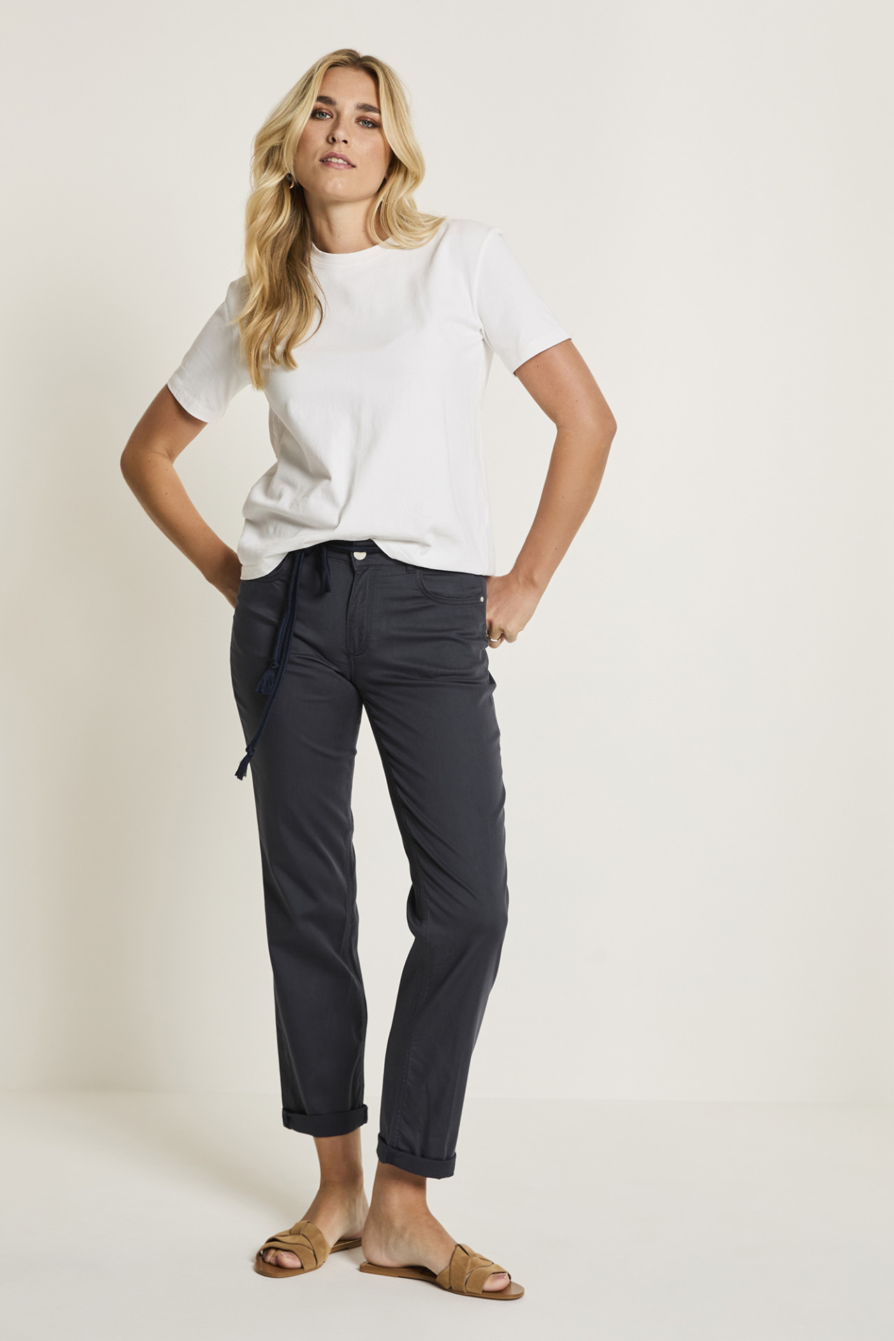 Bobby püksid on stiilsed kõrge vöökohaga naistepüksid, millel on sirge ja veidi avaram säärelõige.Kahekordne ülespööratud sääreosa toob jalanõud kaunilt esile ja sobib suurepäraselt erinevate stiilidega. Dekoratiivne punutud nöörist vöö annab pükstele pilkupüüdva aktsendi.