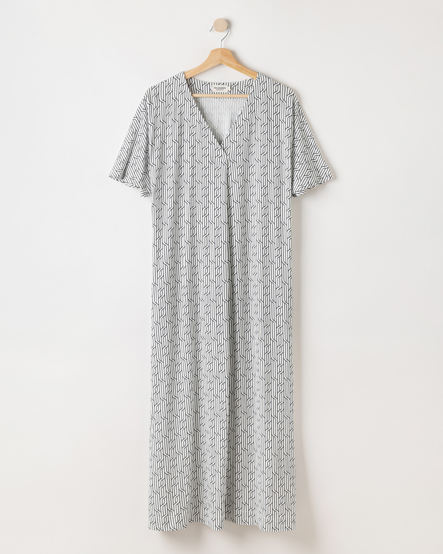 V-kaelusega kleit, valmistatud 93% viskoosist ja 7% elastaanist. Mugav, pehme ja voogav materjal. Vaba istuvus ja laiad varrukad. Keskmine pikkus.