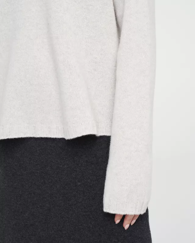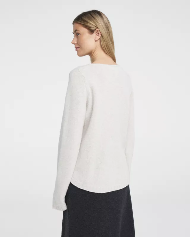 Pehmest villasegust, ümara kaeluse ja alläärega sviiter. Sviitri alläärel ja varrukatel mustriline soonikkude.