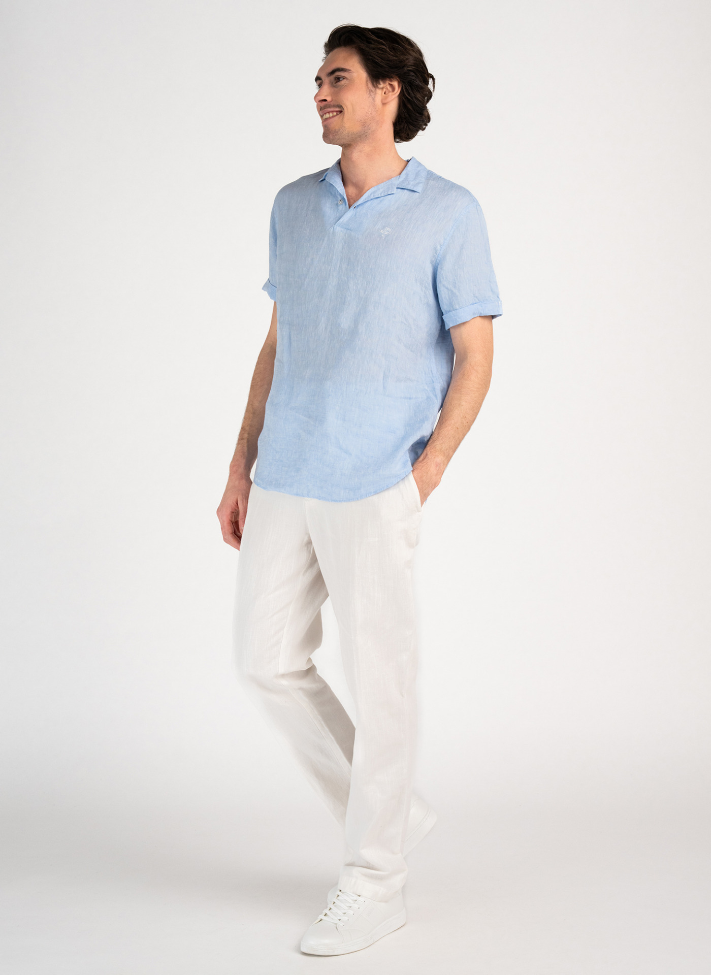 Linen Polo on valmistatud 100% pehmest linasest kangast. See meeste lühikeste varrukatega särk on lahtise kraega ja üleskeeratud varrukaotsaga. Kaunistuseks on P‑logo õlal ja vasakul rinnal.
