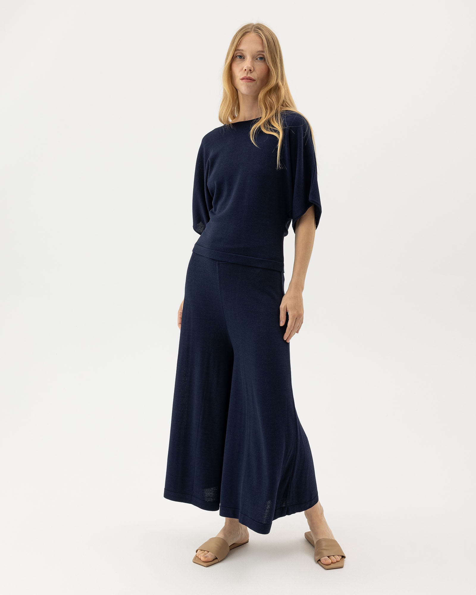 Laiad, hästi langevad püksid. Tavaline istuvus ja veidi lühem säärepikkus. Elastne värvel. Kombineeri Marilyn Topiga, et saada sobiv komplekt. Toodetud jätkusuutlikult Euroopas.