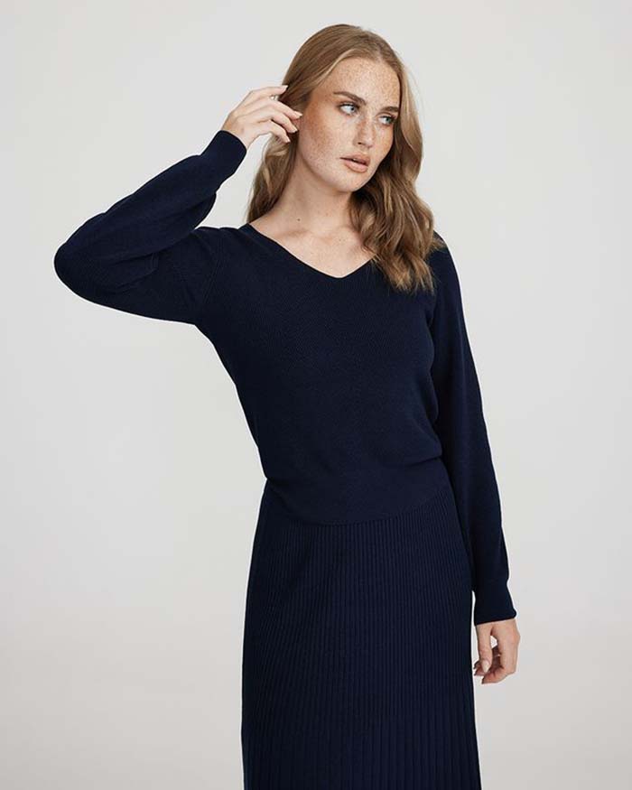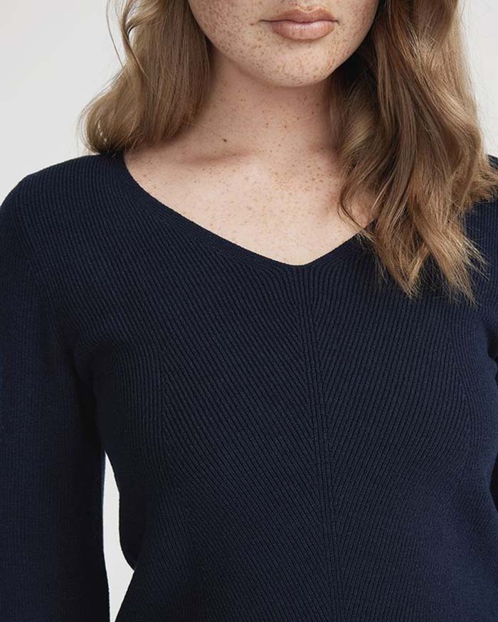 Avara V-kaelusega sviiter, õrnalt läikiva pinnaga. Varrukas veidi puhvis ja varruka otsas soonik. Elegantne valik, sobib nii peole kui igapäevaseks kandmiseks.