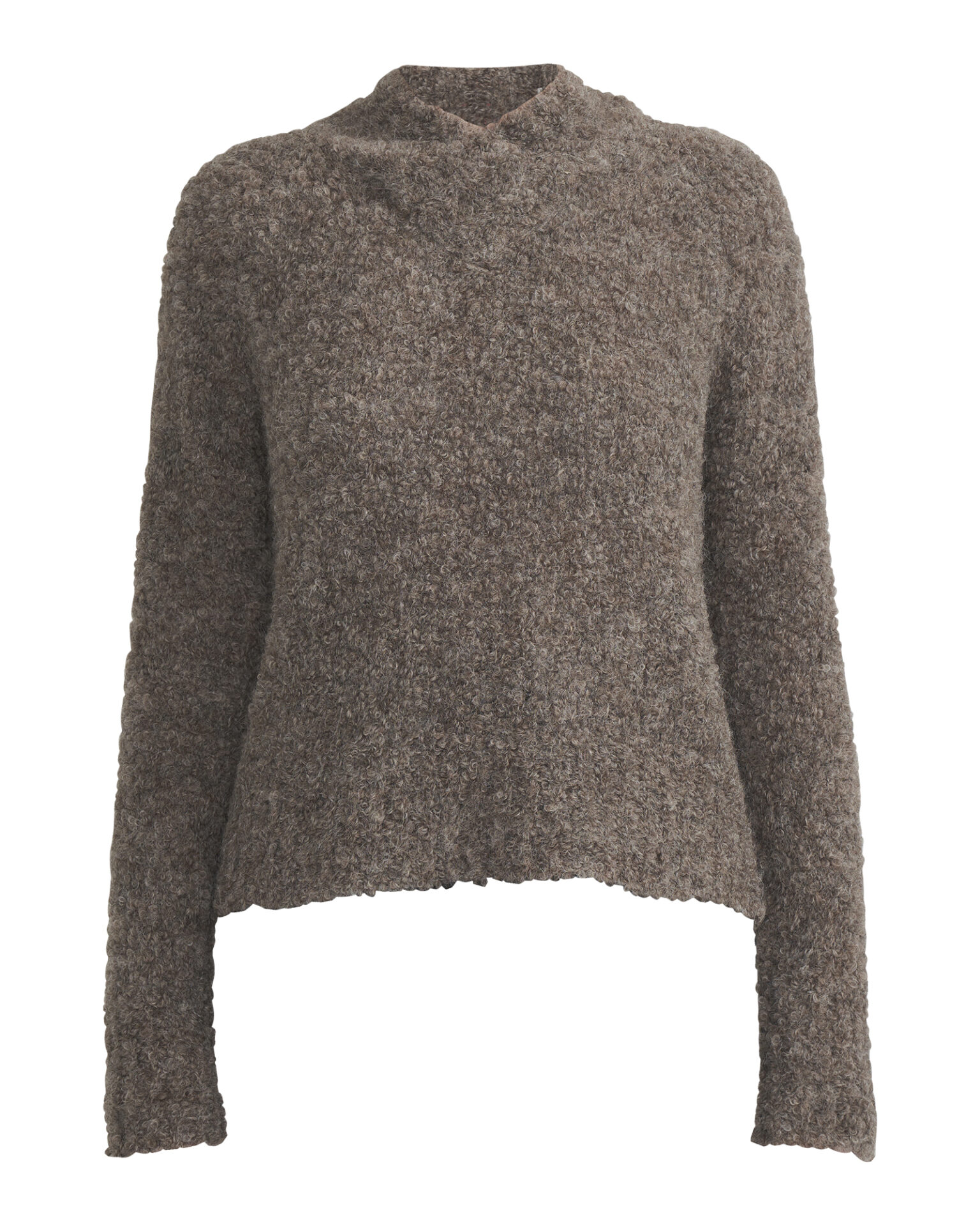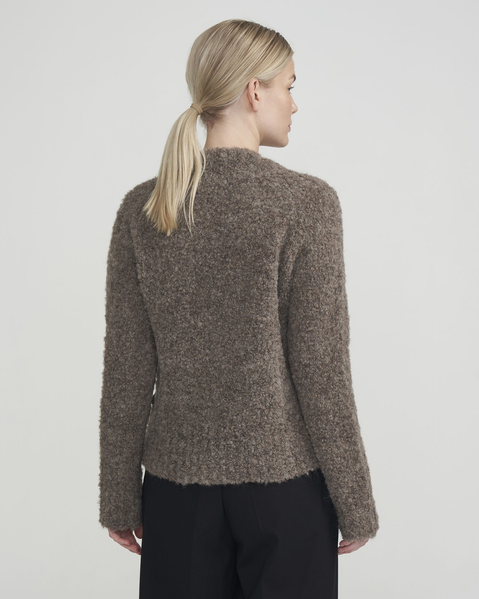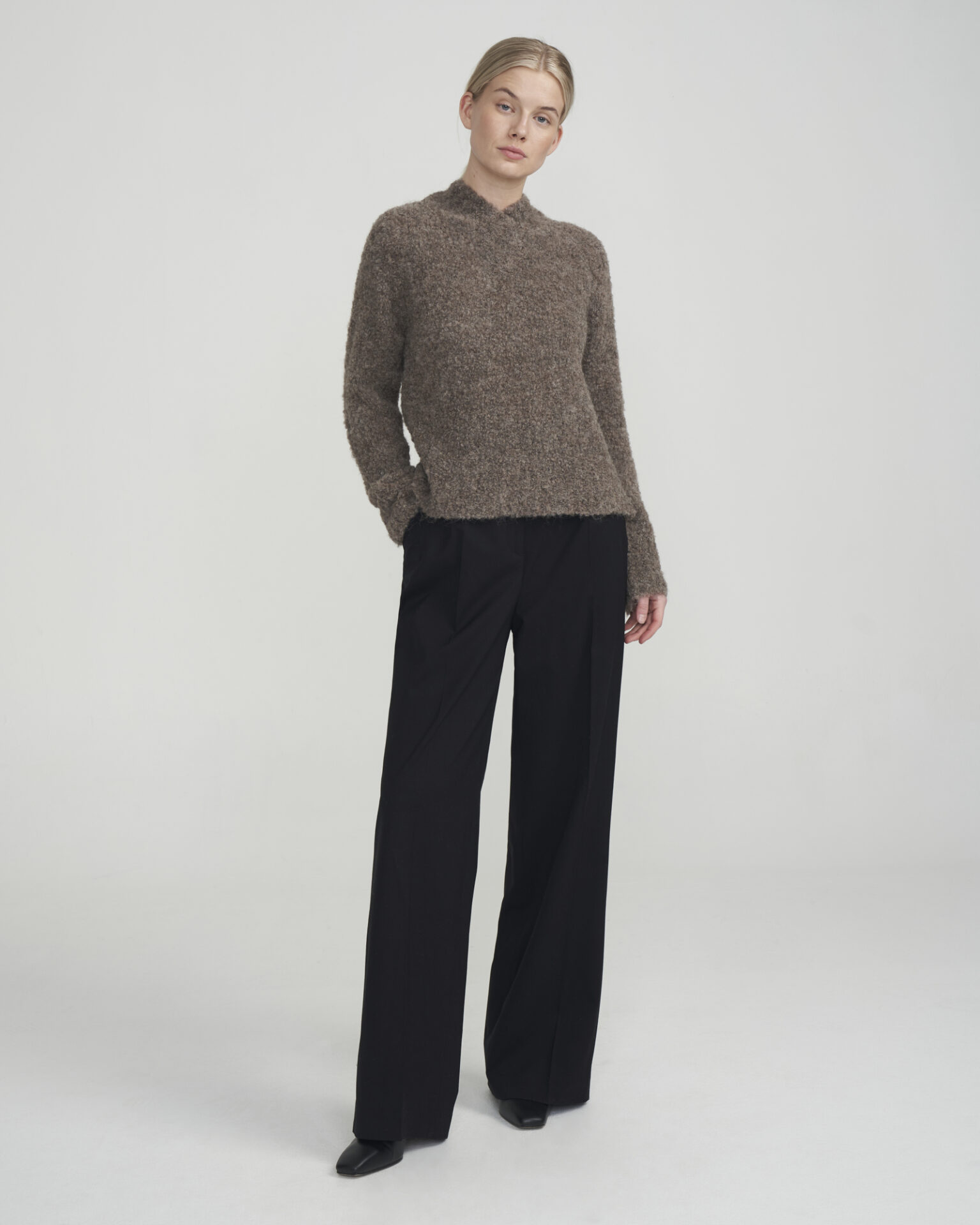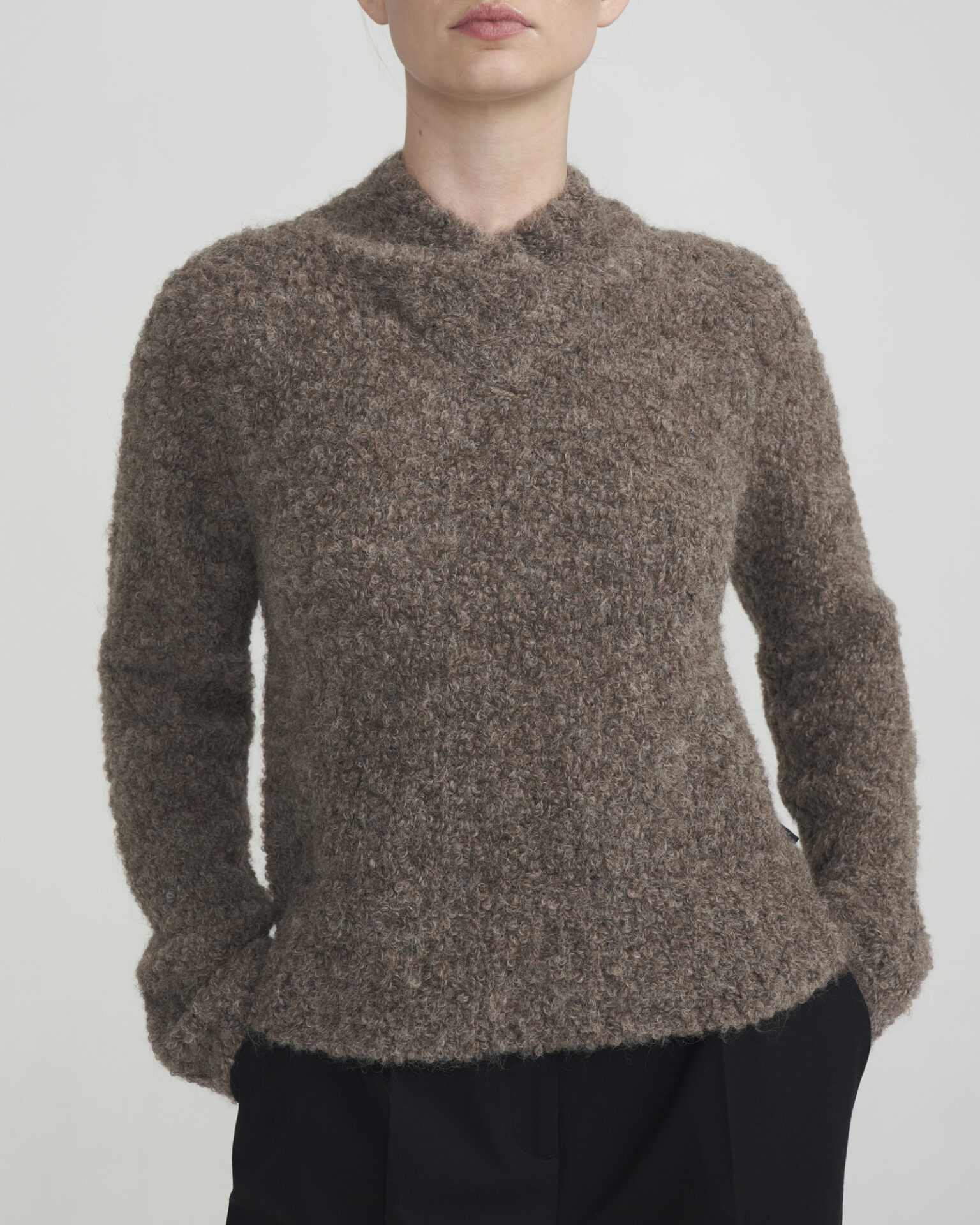 Kootud sviiter ülipehmest alpaka segust. Sviitri lõng on värvimata, mis tähendab, et värvil on loomulik varjund. Kõrge V-kaelus laia soonikkoega.