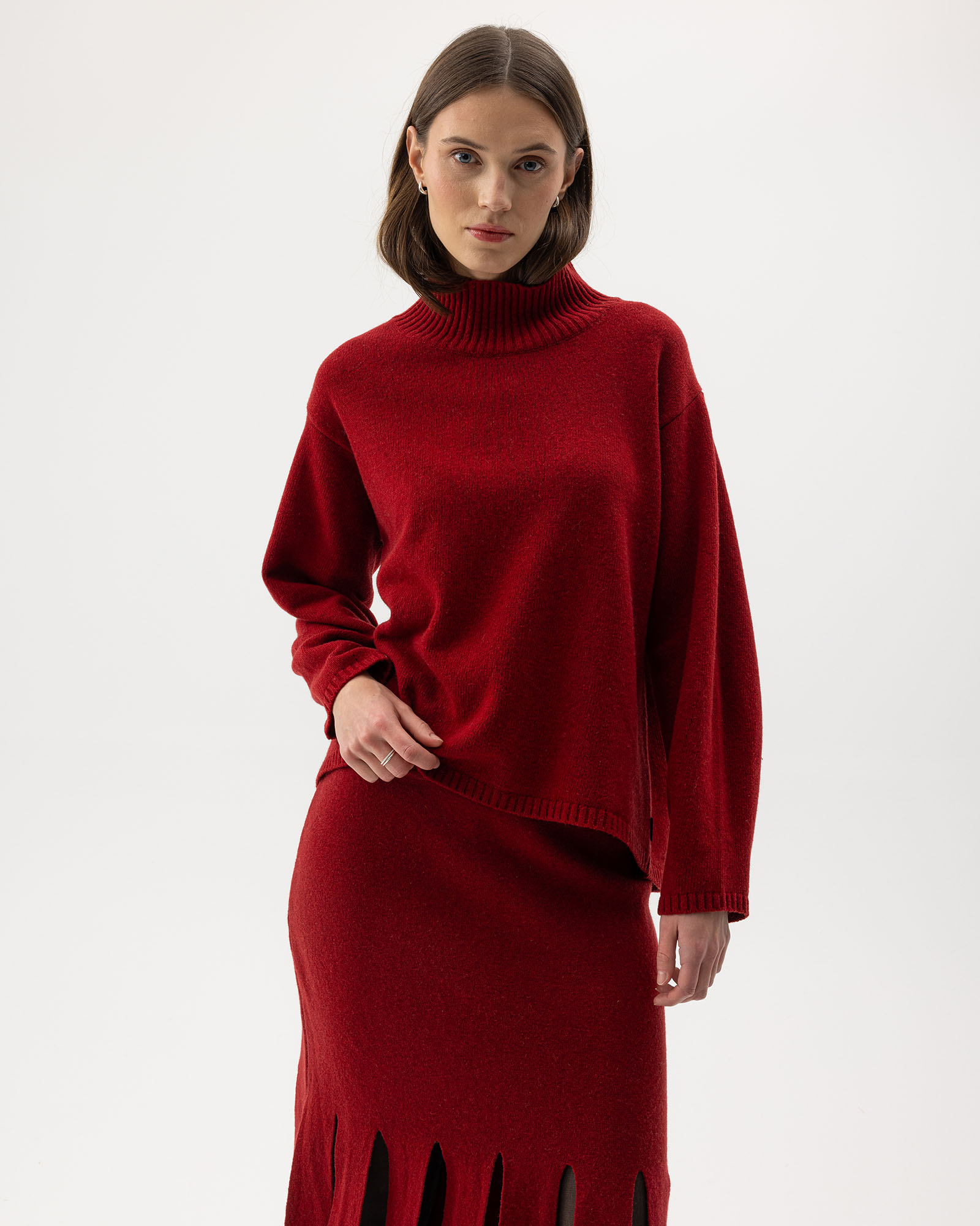 Siledas koes villasegust sviiter, kõrgendatud kaelusega. Vaba lõige ja veidi pikendatud seljaosa. Viimistletud kitsa äärega. Sobita Sonja pükstega, et luua ühtne komplekt. Toodetud jätkusuutlikult Euroopas.