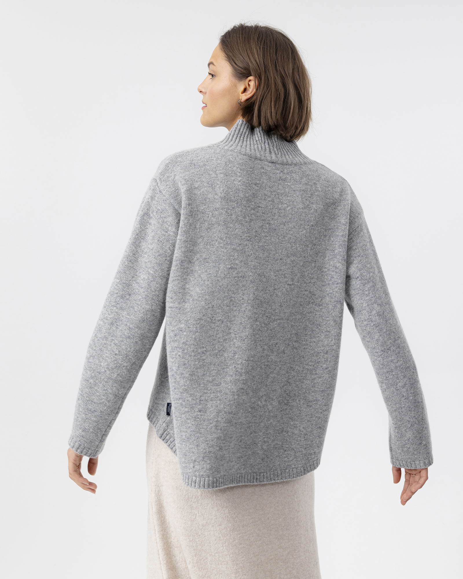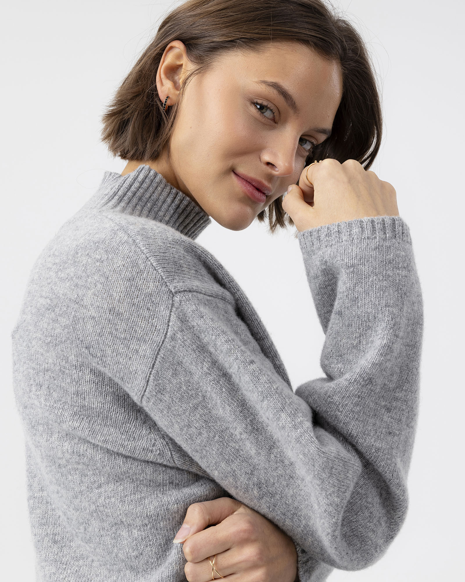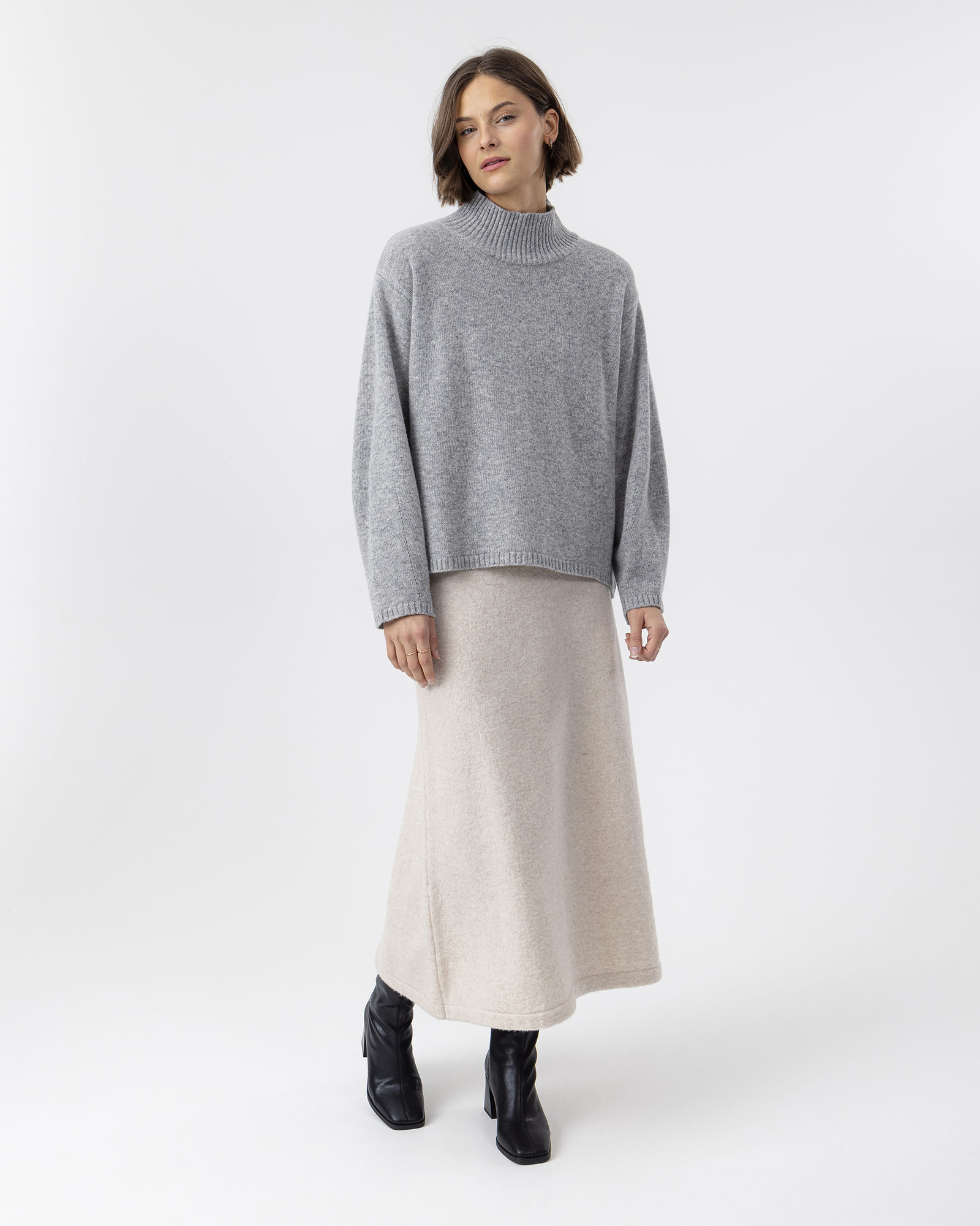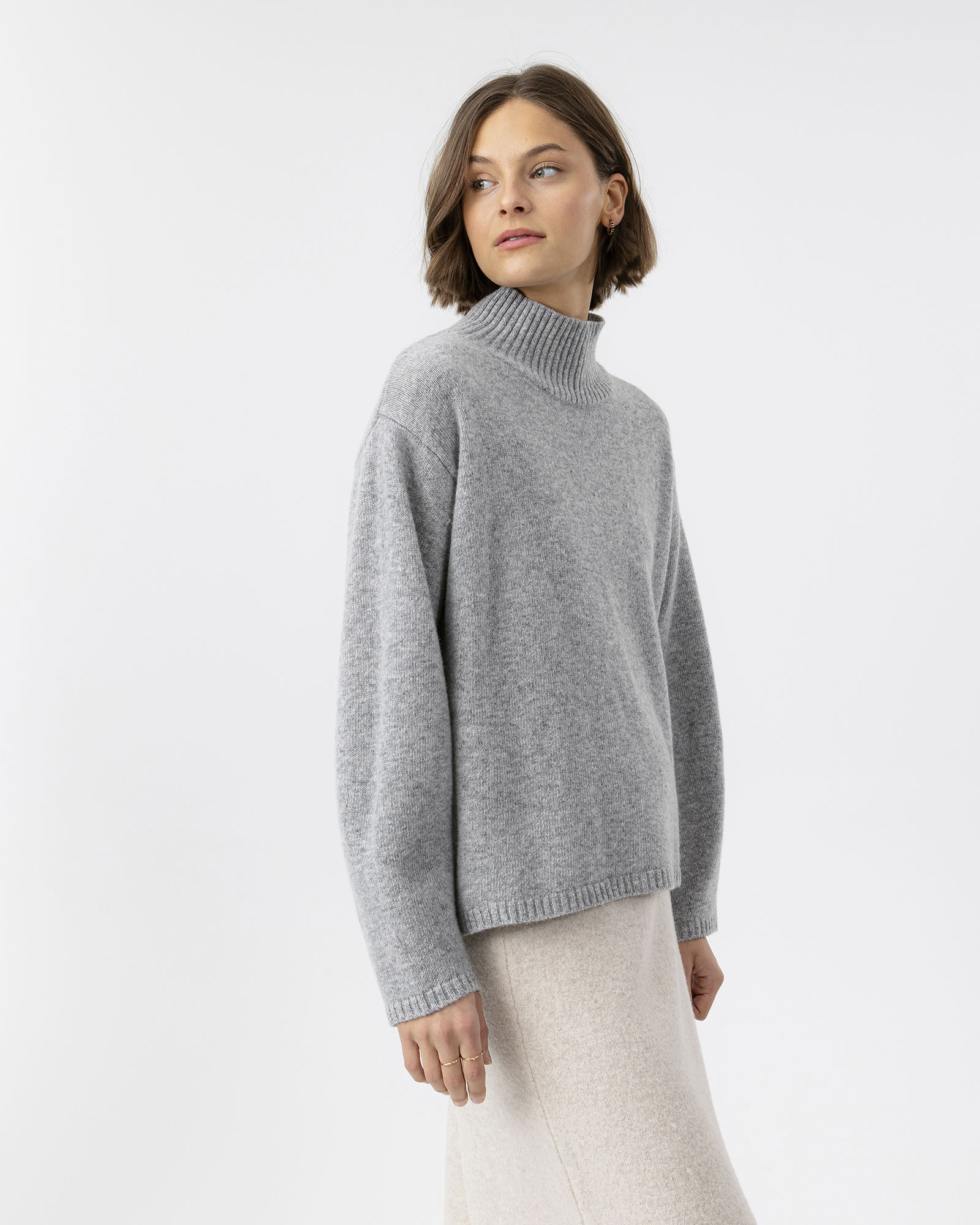 Siledas koes villasegust sviiter, kõrgendatud kaelusega. Vaba lõige ja veidi pikendatud seljaosa. Viimistletud kitsa äärega. Sobita Sonja pükstega, et luua ühtne komplekt. Toodetud jätkusuutlikult Euroopas.